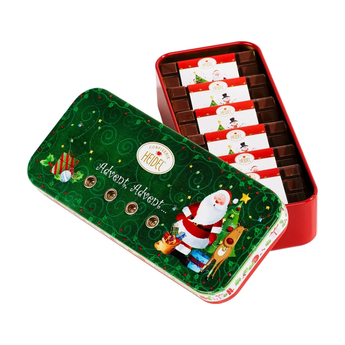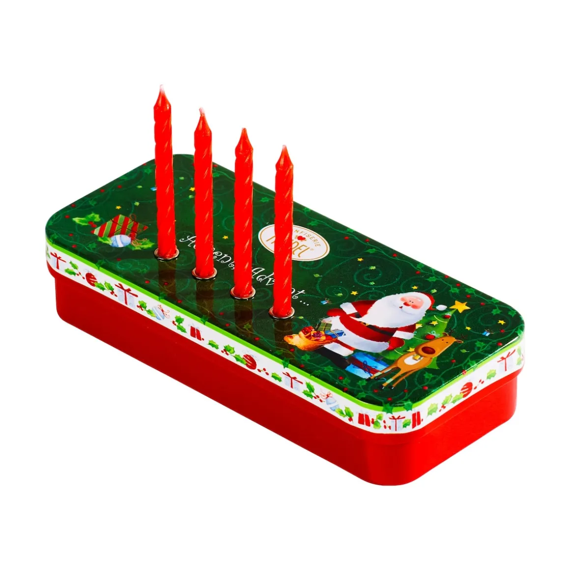 Ja, auch so kann ein Adventskranz heute aussehen. Eben nicht als Kranz, sondern in Form einer Metallbox, in deren Löcher die 4 mitgelieferten Kerzen gesteckt werden können. So kommen auch unterwegs richtige Adventsgefühle auf. Box gefüllt mit 6 Schoko-Täfelchen (je 10 g).