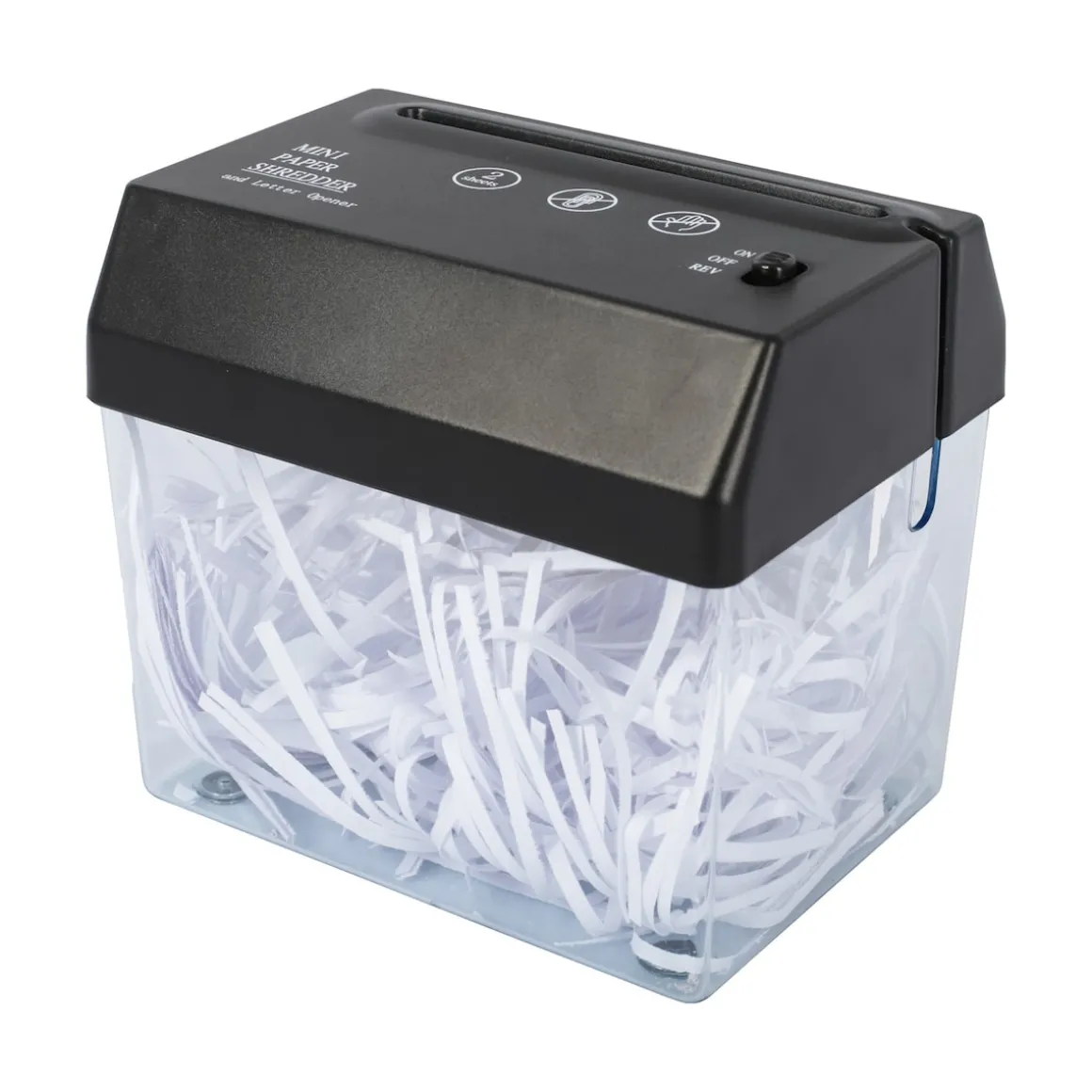 Vernichtet vertrauliche Akten zuverlässig! Der elektrische Aktenvernichter schreddert bis zu 0,35 mm dickes Papier im Handumdrehen. Fasst 1,6 Liter Papierschnipsel. Betrieb mit Batterien und USB-Kabel möglich. Batterien bitte extra bestellen.