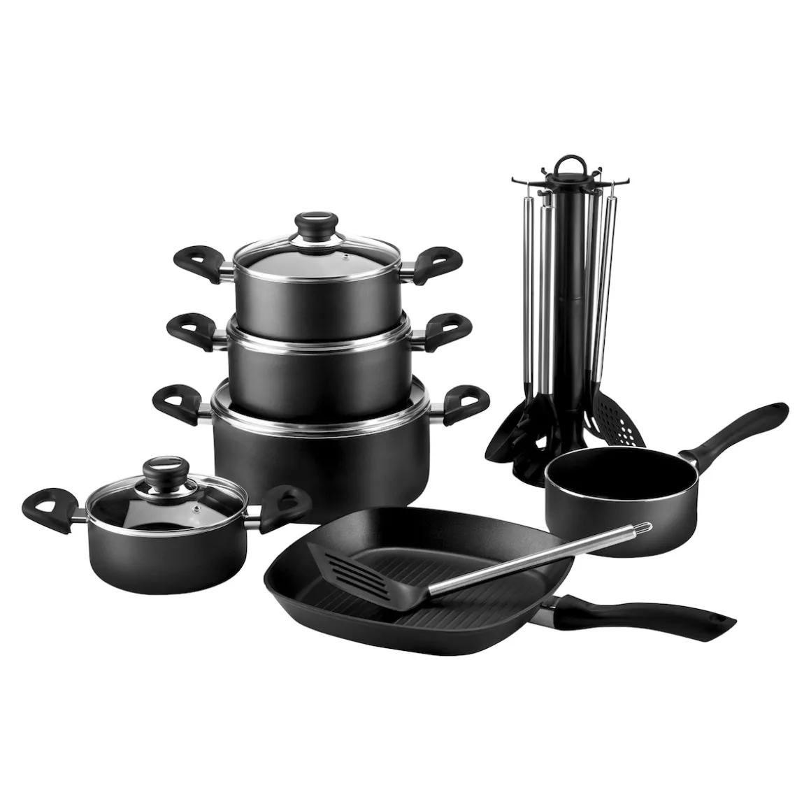 Das 17-teilige Aluguss-Topfset macht gesundes Kochen zum Kinderspiel. Die Töpfe und die Steakpfanne bestehen aus robustem Aluguss und sind mit komfortablen Kunststoffgriffen ausgestattet. Dank der hochwertigen Antihaft-Beschichtung benötigen Sie nur wenig Fett, was Ihre Gerichte besonders gesund macht. Die schwere Qualitätsausführung sorgt für eine optimale Wärmeverteilung und langanhaltende Wärmespeicherung. Die Töpfe sind hitzebeständig bis 180°C (mit Deckel bis 160°C) und spülmaschinenfest, was die Reinigung erleichtert. Zusätzlich enthält das Set sechs praktische Küchenhelfer und einen Ständer, die Ihnen die Zubereitung Ihrer Gerichte erleichtern. Geeignet für alle Herdarten außer Induktion.
