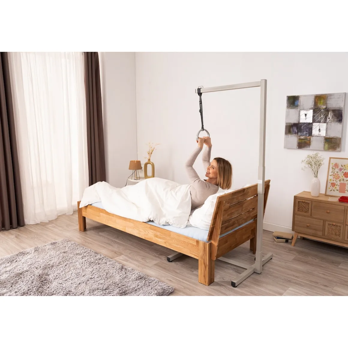 Mit dieser Aufrichthilfe können Sie sich auch im Krankheits- oder Pflegefall sicher im eigenen Bett aufrichten. Sie unterstützt beim Aufrichten aus einer liegenden in eine sitzende Position, hilft aber ebenso beim Anheben des Gesäßes, um eine Bettpfanne zu verwenden. Auch kann der 176 cm hohe Bettgalgen als Sicherungshilfe beim Umsetzen vom Bett in einen Roll- oder Toilettenstuhl dienen. Die Griffhöhe lässt sich an dem Gurt einstellen (1,24 bis 1,33 m vom Boden aus) und damit an die eigene Körpergröße anpassen.