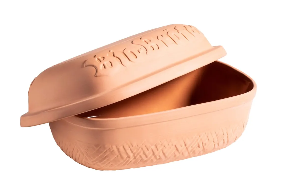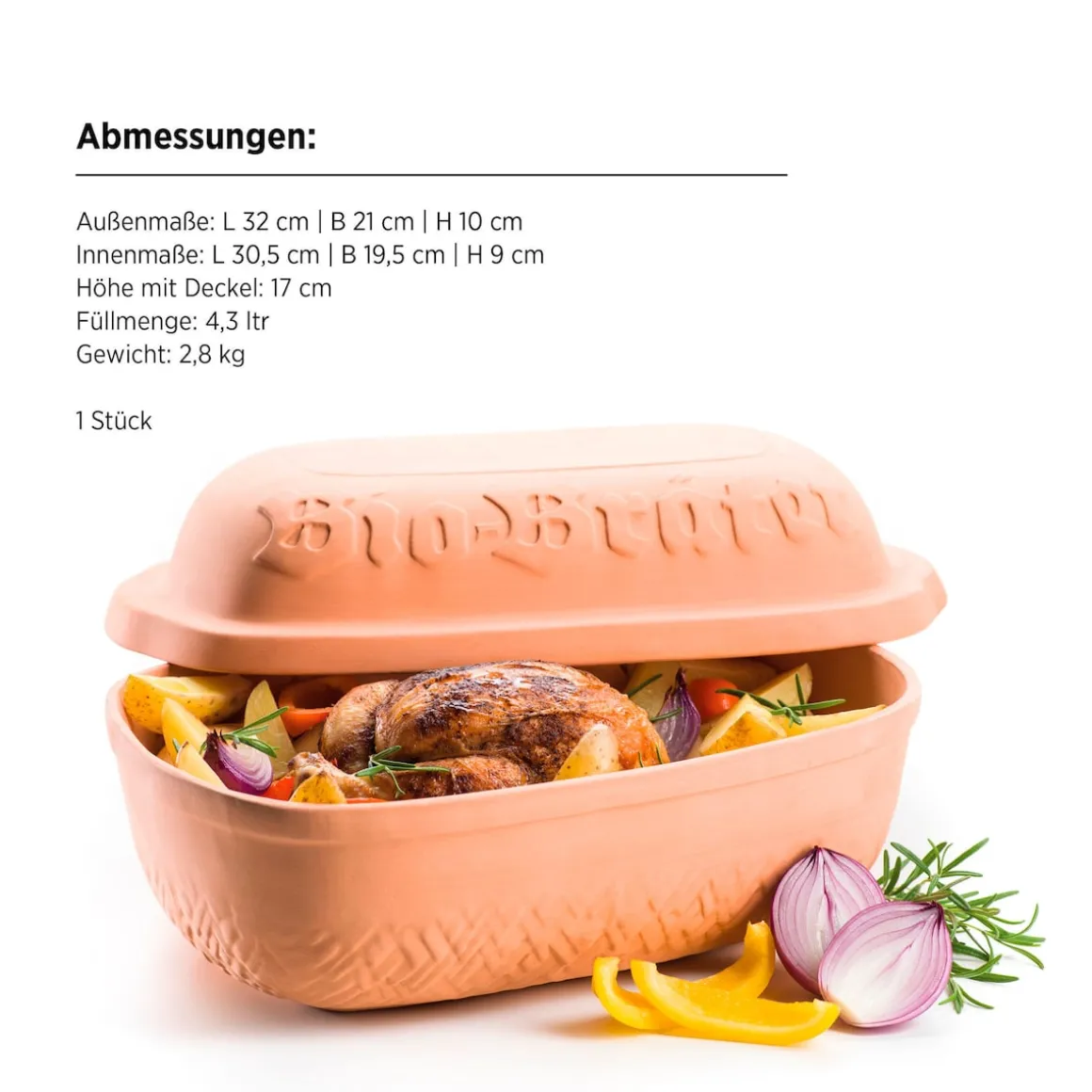 Mit diesem vielseitigen Bio Bräter der österreichischen Traditionsmarke MÄSER zaubern Sie mühelos einen perfekten Sonntagsbraten auf den Tisch. Der Schmortopf mit Deckel aus feinem, naturbelassenem Ton ermöglicht durch die natürliche Wasserspeicherung ein besonders schonendes Dampfgaren ohne weitere Fettzugabe. Alle Vitamine und Nährstoffe bleiben erhalten. Servieren Sie Braten, Ente, Gans, Auflauf, Gemüse, Brot und anderes Gargut direkt im Tontopf aus dem Backofen auf Ihren Esstisch. Ein Festmahl für alle Sinne.