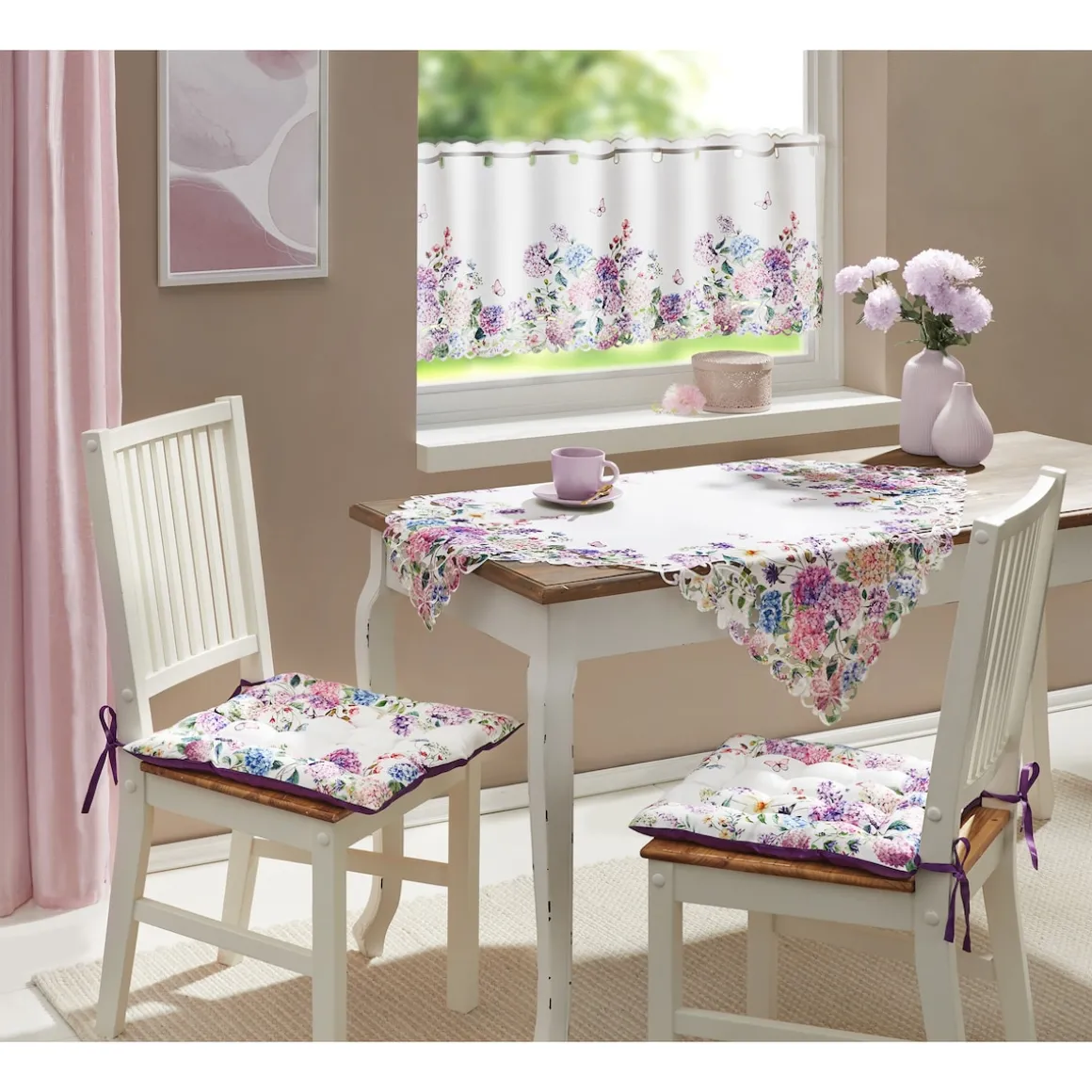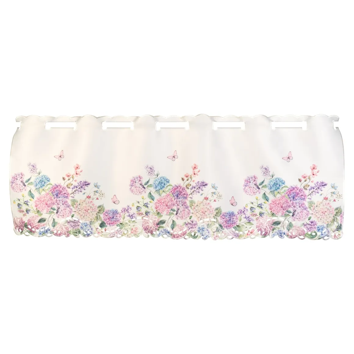Diese Bistrogardine bringt Eleganz und Leichtigkeit in Ihr Zuhause. Das kunstvolle Design mit Schmetterlingen und Hortensien wird durch goldene Umrandungen veredelt. Halb bestickt, halb geprintet – ein dekoratives Highlight für Küche, Esszimmer oder Wohnbereich.
