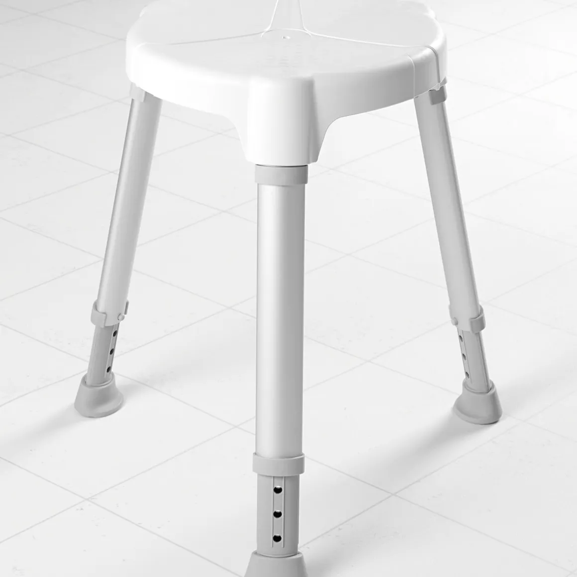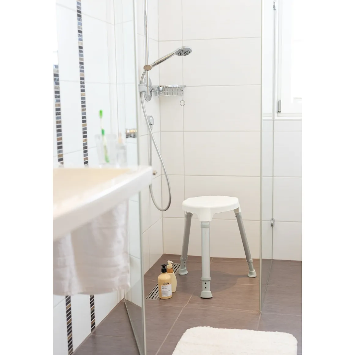 Rund und kompakt, passt auch in kleine Duschen sowie in die Badewanne. Standbeine höhenverstellbar. Die Gummifüße sorgen für Rutschsicherheit. Oberflächenstruktur Softtouch, schmutz- und wasserabweisend, für sicheren Halt und leichte Reinigung. Belastbar bis 130 kg.