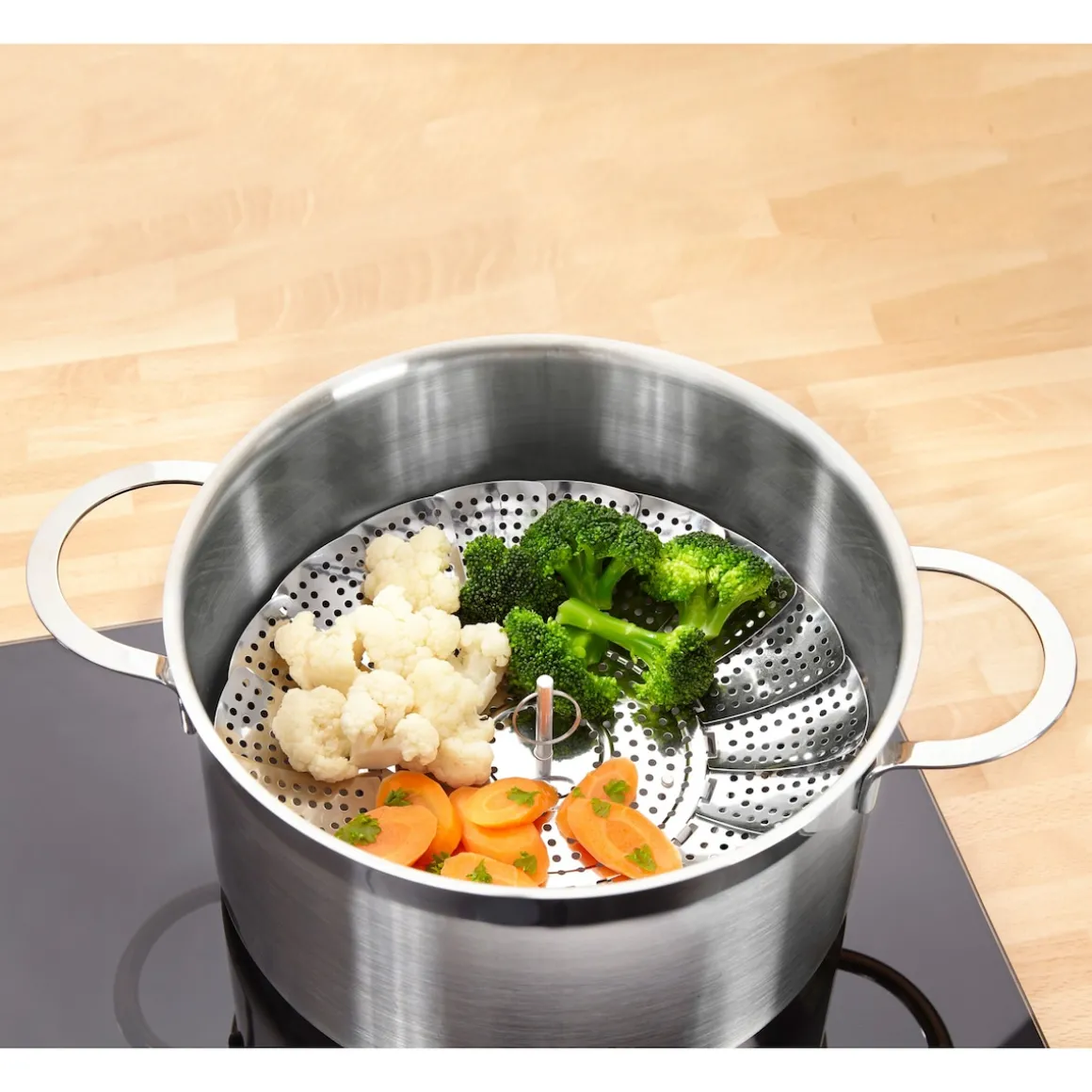 Mit diesem Dünster wird das Dampfgaren von Gemüse und anderen Lebensmitteln zum Kinderspiel. Denn er passt sich dank der flexibel überlappenden Elemente jedem Topf an. Eine geniale Alternative zu herkömmlichen Dampfgarern!
