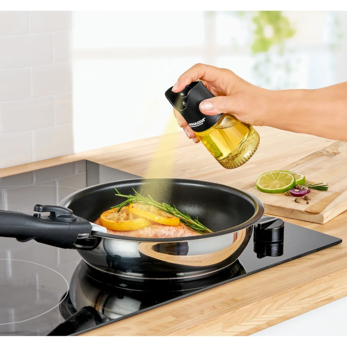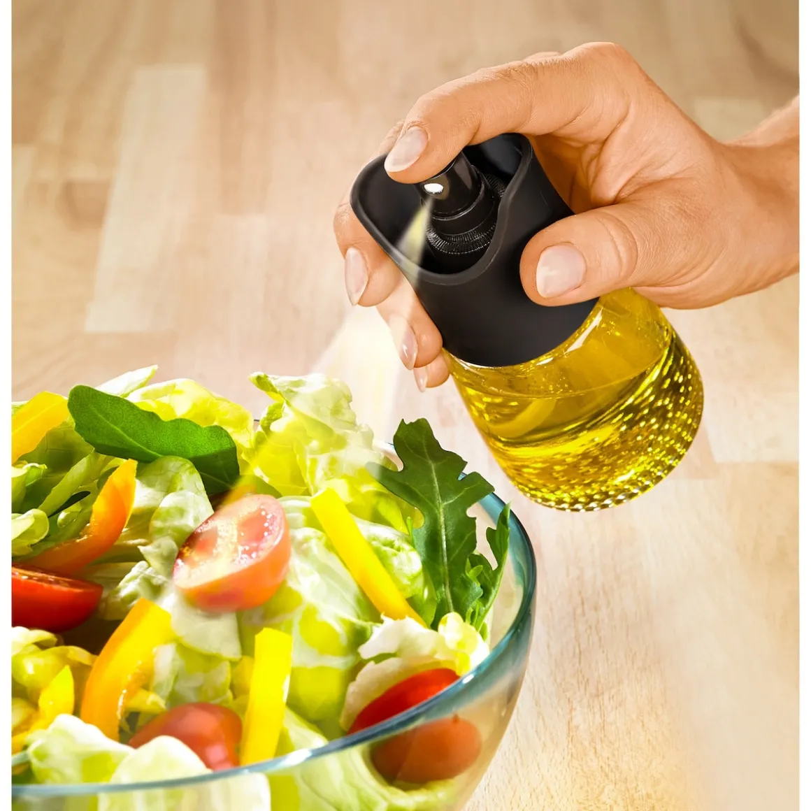 Durch das Zerstäuben sammelt sich das Dressing nicht mehr am Boden der Schüssel, sondern haftet auf der Oberfläche der Lebensmittel. Das verbessert den Eigengeschmack der frischen Zutaten und reduziert die aufgenommenen Kalorien. Denn im Gegensatz zur herkömmlichen Methode gelangen mit jedem Sprühstoß nur wenige Milliliter des Essig/Öl-Mixes auf den Salat. Somit eignet sich der Essig/Öl-Sprüher auch sehr gut für eine figurbewusste Ernährung. Selbstverständlich können Sie die aus Glas und Kunststoff gefertigte Sprühflasche auch nur mit Essig oder Öl befüllen. Auf diese Weise können Sie die Dosierhilfe auch zum sparsamen Einfetten von Pfannen, Grillrosten oder Waffeleisen verwenden und pro Mahlzeit bis zu 100 Kalorien einsparen.