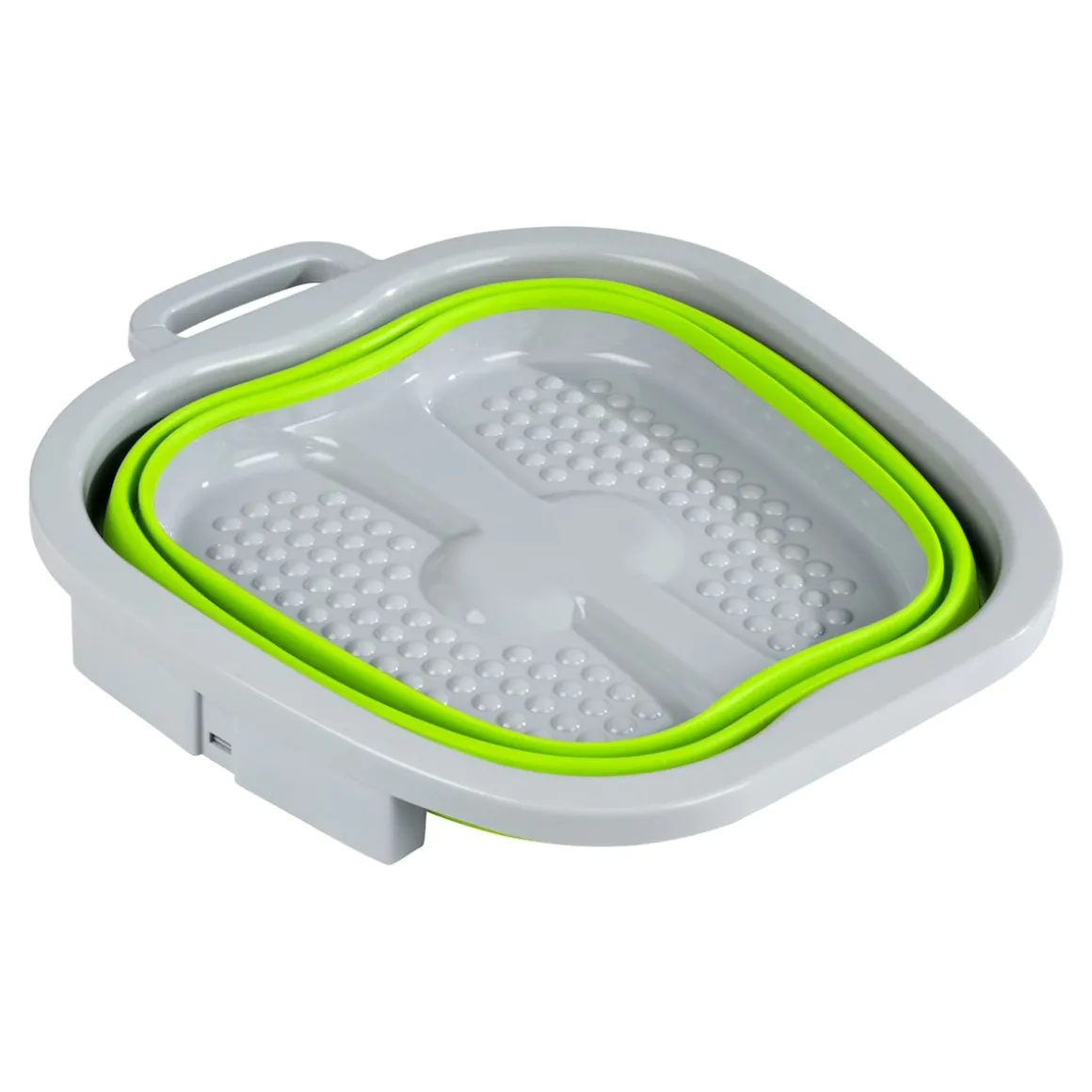 Um den Füßen eine wohlverdiente Auszeit zu gönnen, werden die Seitenteile des in modernem hellgrün und grau gestalteten Wellness-Pools einfach ausgeklappt und der Boden nach unten gedrückt. Sobald die Seiten eingerastet sind, kann auch schon das Wasser eingelassen werden. Jetzt heißt es: rein mit den Füßen, zurücklehnen und entspannen! Für einen sicheren Stand auf glatten Untergründen wie Fliesen oder Laminat sorgen währenddessen die vier rutschfesten Gummifüße. Ist das Fußbad getrocknet, genügt es auf die roten Knöpfe an den Seitenteilen zu drücken, um es wieder platzsparend zusammenzufalten.