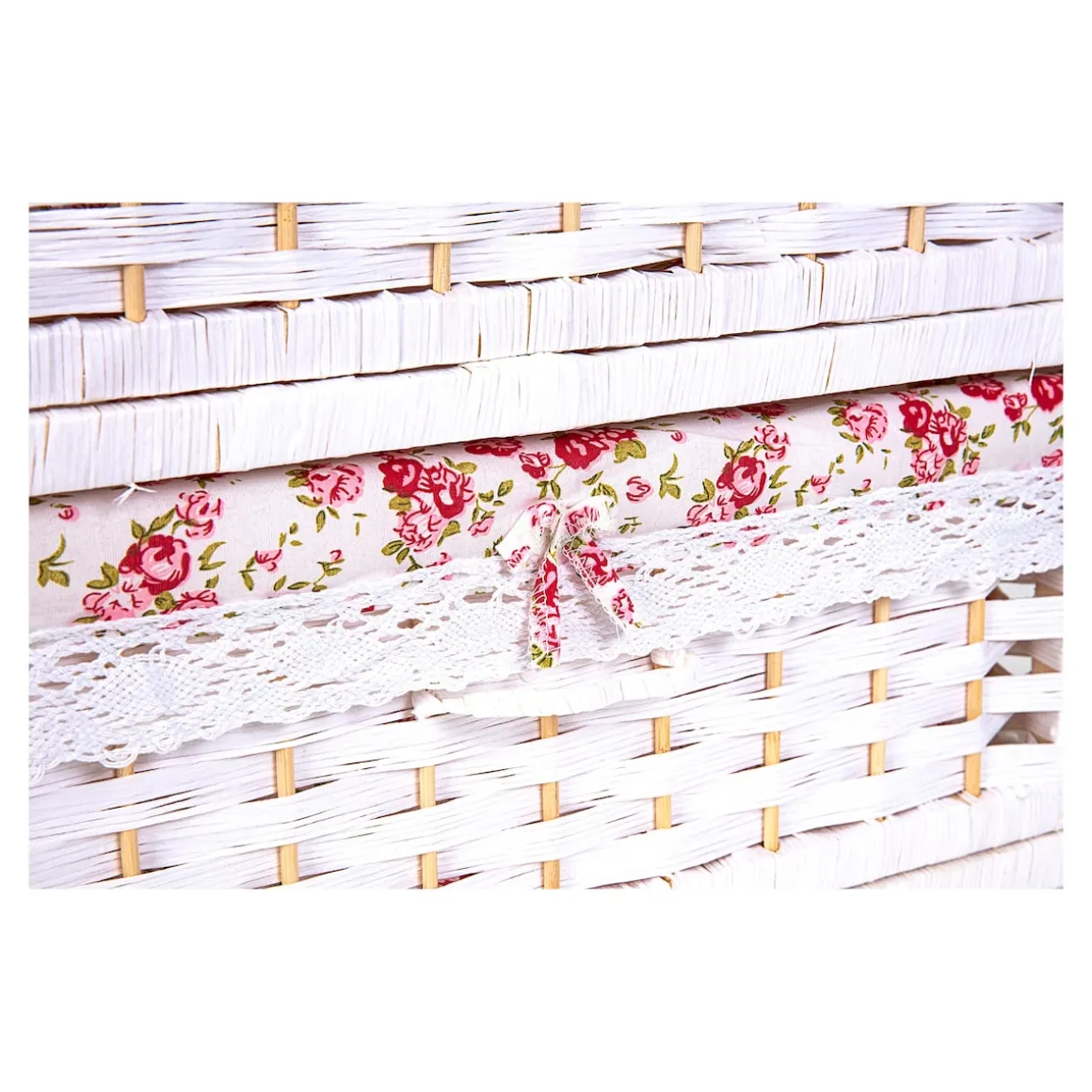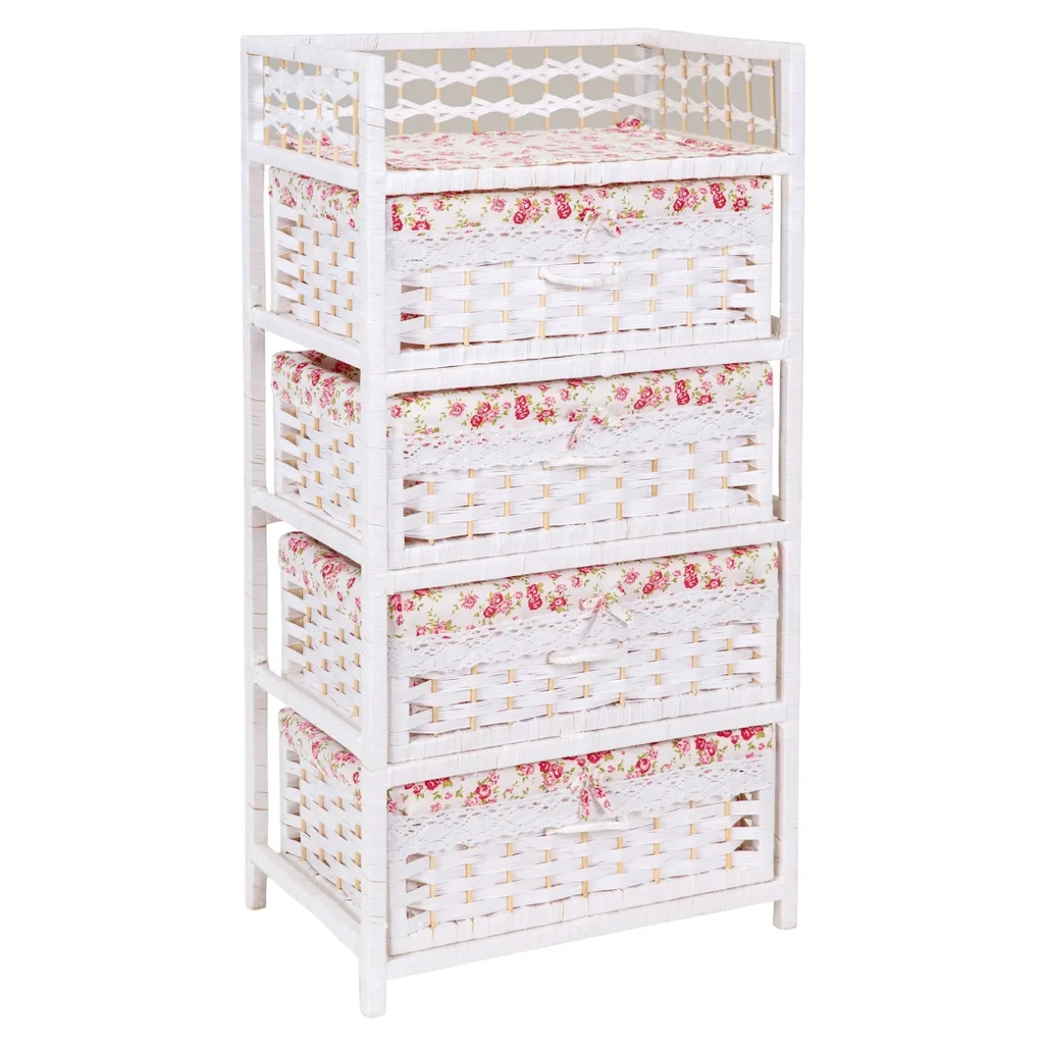 Ein Hauch von Nostalgie und Eleganz, der Ihr Herz höherschlagen lässt! Die Kommode verzaubert mit ihrer modernen Flecht-Optik und den geräumigen Fächern jeden Tag aufs Neue: Das romantische Rosenmotiv schafft eine warme Atmosphäre. Gleichzeitig sorgen zarte Rüschenbänder und hübsche Schleifchen für einen bezaubernden Blickfang.