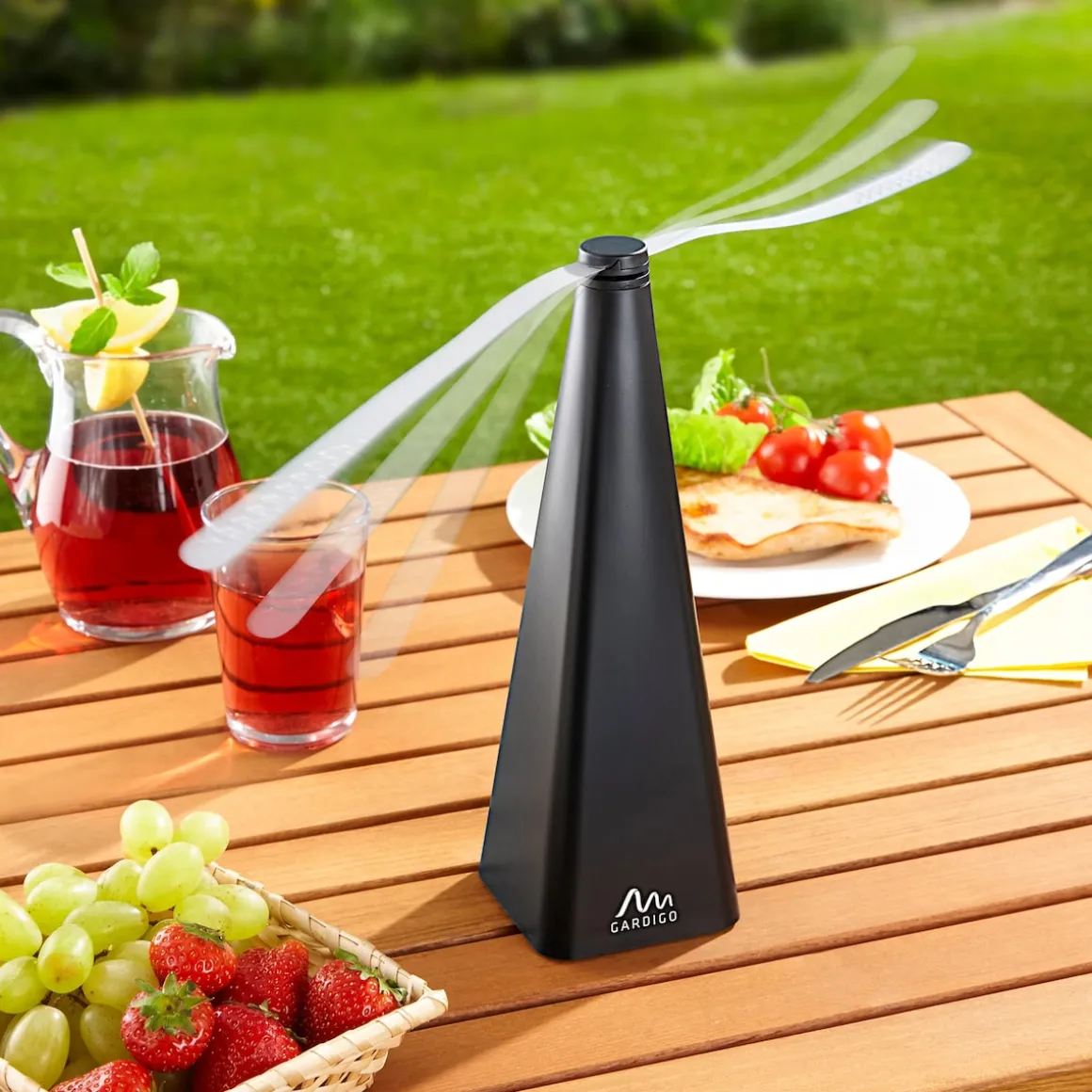 Endlich Ruhe vor Fliegen und anderen Insekten, ohne ihnen ständig hinterherzujagen! Stattdessen stellen Sie einfach diese dekorative Pyramide auf, die sämtliche Fliegen zuverlässig hinwegwedelt. Die schimmernden Wedelblätter wirken zusätzlich abwehrend!