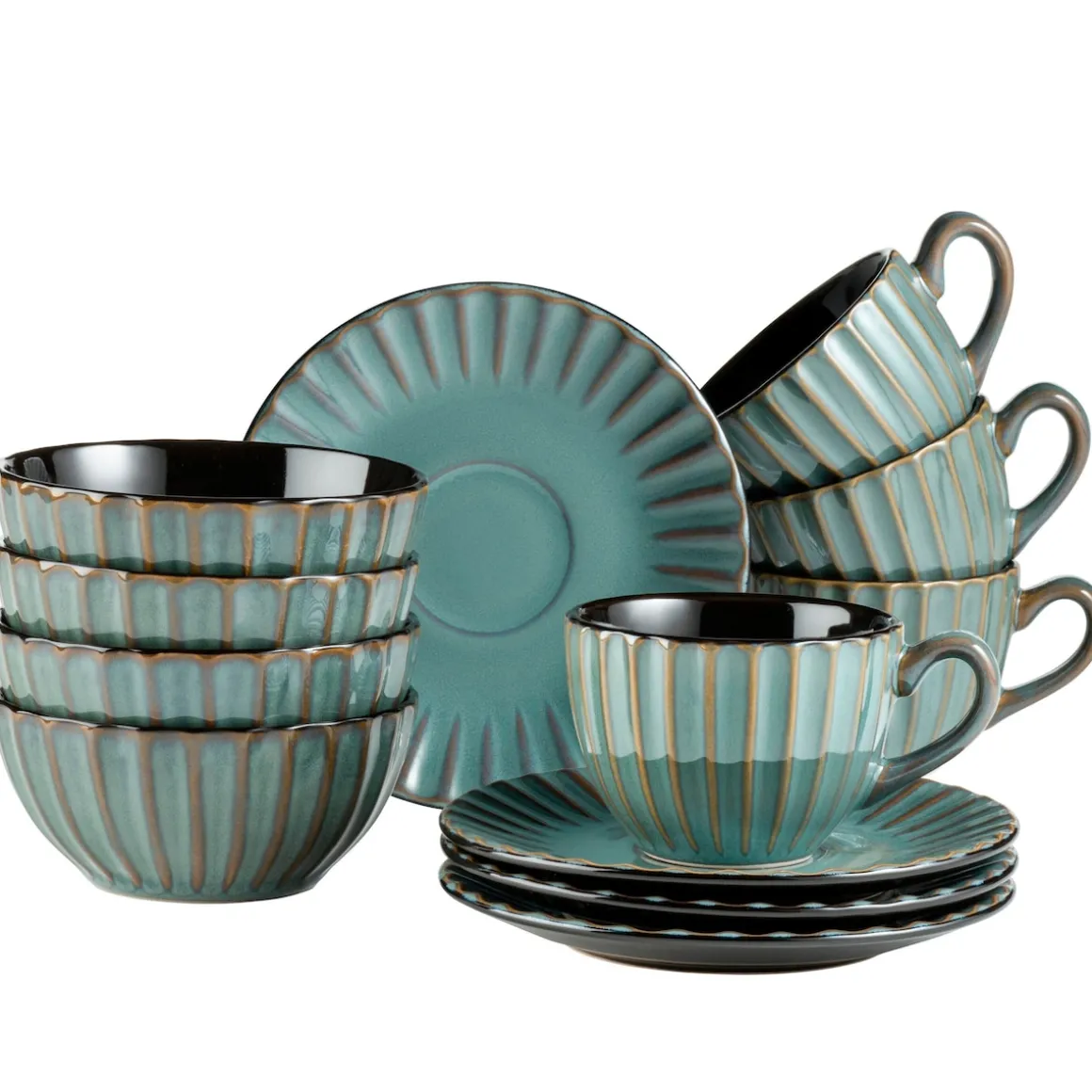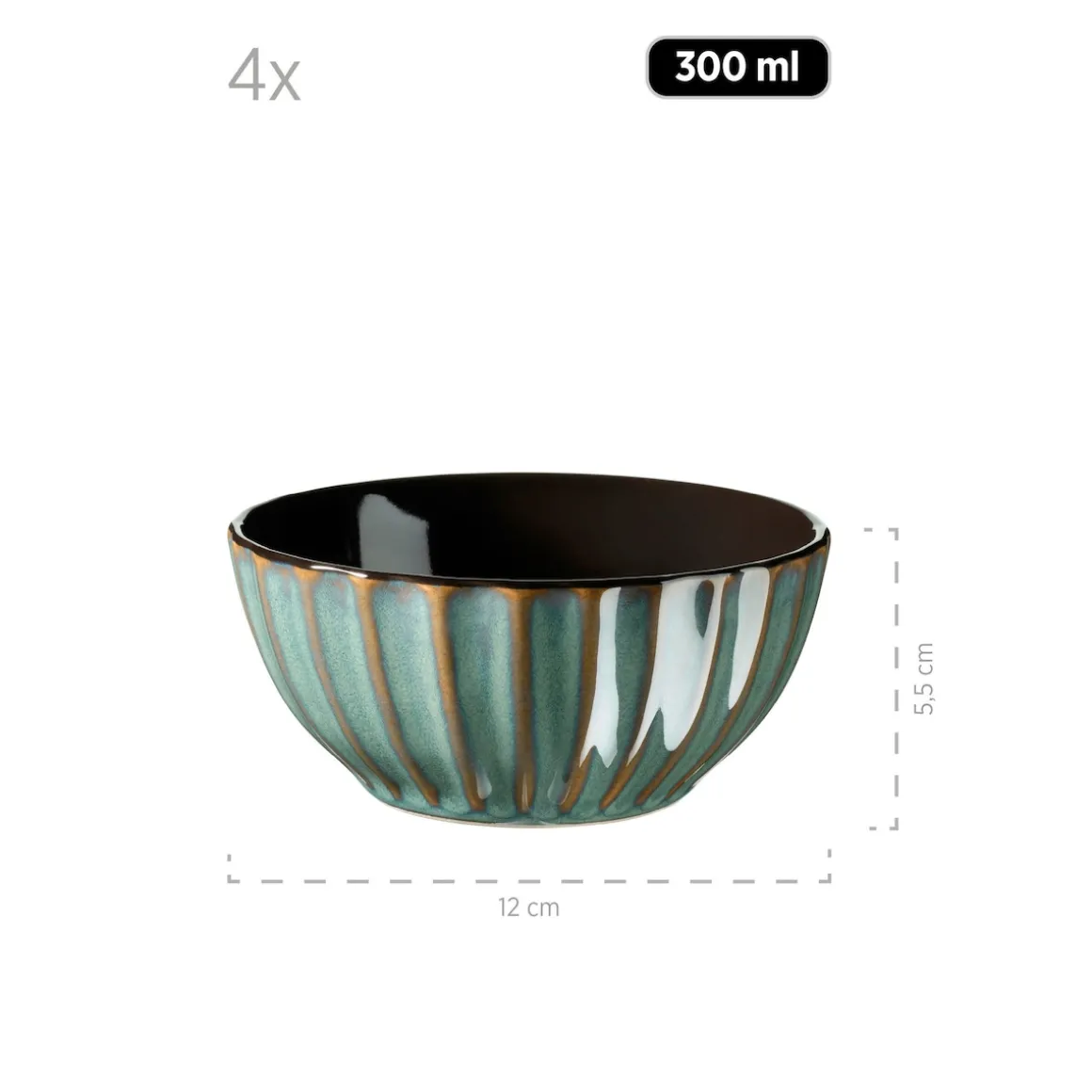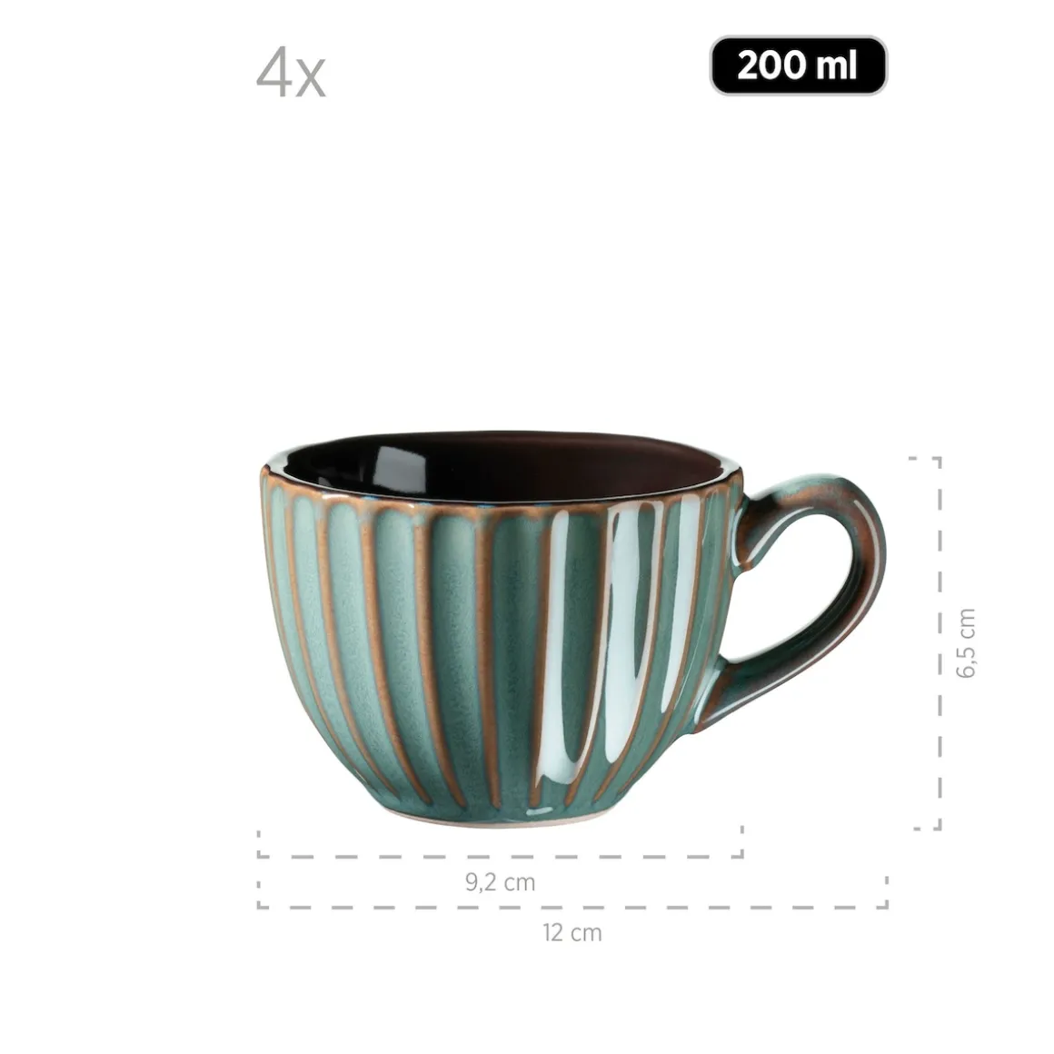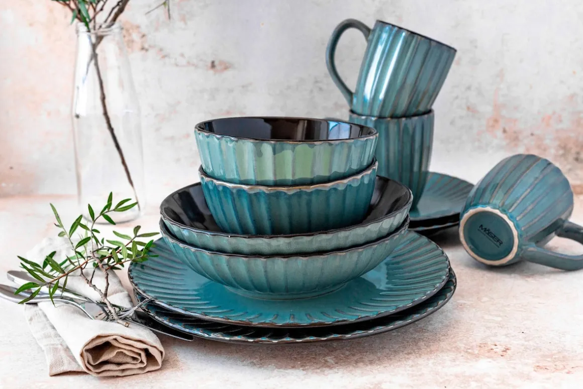 Die aufregende Kombination aus runden Retro-Formen mit Wellenrelief einerseits und einer modernen, unregelmäßigen Glasurtechnik mit schwarzen Akzenten andererseits verleiht der Tafelgeschirr-Kollektion „Confino“ eine ganz besondere Eleganz. Die Keramikgeschirr-Serie der österreichischen Traditionsmarke MÄSER wird aus hochwertigem Steinzeug gefertigt, welches nicht mit dem deutlich brüchigeren Steingut zu verwechseln ist. Die natürlich wirkenden Farbvarianten dieser Kollektion lassen sich harmonisch miteinander kombinieren. Dieses Set wird in einer vielfach auf Bruchsicherheit getesteten Paketversandverpackung aus ressourcenschonenden Materialien versendet. Bitte beachten Sie: Diese Kollektion wird händisch bunt lasiert, wodurch minimale Unebenheiten der Glasur, kleine Einschlüsse und leichte Farbabweichungen auftreten können. Zur besseren objektiven Vergleichbarkeit gehen unsere Füllmengenangaben von einer randvollen Befüllung aus.