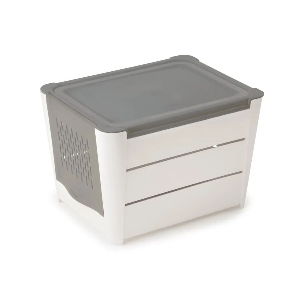 Die Box bietet Platz für etwa drei Kilogramm Obst oder Gemüse. Dieses lässt sich leicht über die Klappöffnung einfüllen und entnehmen. Dank ihres kompakten Designs passt sie gut in jeder Küche auf die Arbeitsplatte, lässt sich aber genauso im Keller oder Vorratsraum aufstellen. Da die Boxen stapelbar sind, können bei Bedarf mehrere problemlos übereinandergestellt werden. Das ist sinnvoll, um Obst- und Gemüsesorten, die sich nicht so gut vertragen (z. B. Äpfel und Kartoffeln), zu trennen oder einfach System in die Vorratshaltung zu bringen.