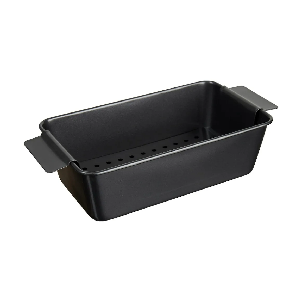 Einfach Ihr Lieblings-Hackbratenrezept zubereiten, in die gefettete Form geben und ab damit in den Ofen – Sie werden begeistert sein. Durch den herausnehmbaren Einsatz ohne Seitenteile ist die Entnahme aus der Form und das Aufschneiden ein Kinderspiel. Außerdem bleibt überschüssiges Fett durch Löcher im Boden des Einsatzes in der Form zurück. Material: Antihaftbeschichtetes Metall. Maße: ca. 25 x 14,5 x 7,5 cm. Hitzebeständig bis 200°C.