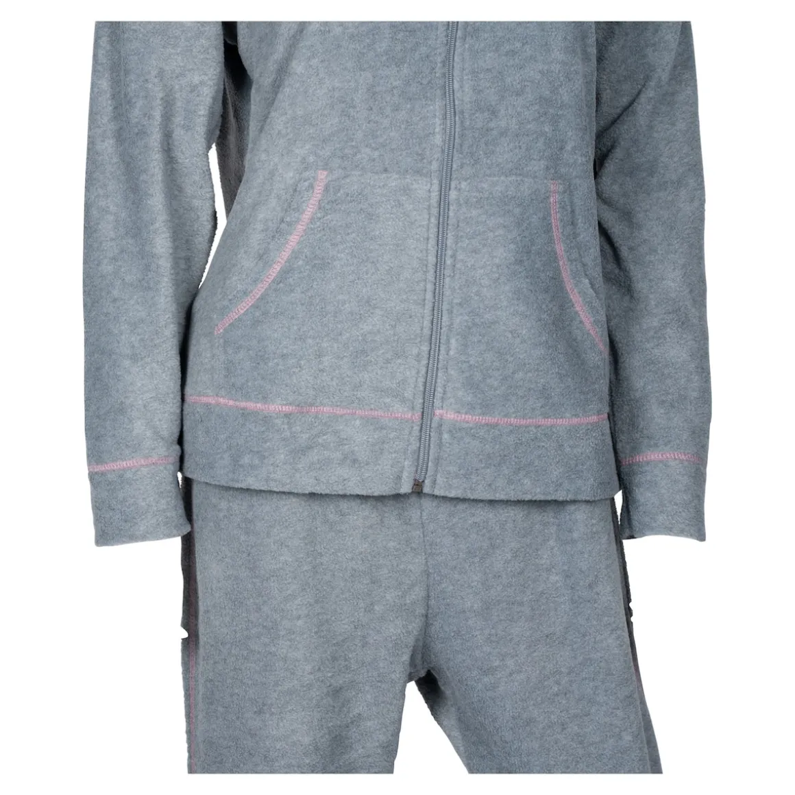 Mit dem Hausanzug Jubi ist Wohlfühlen leicht, denn er besteht aus einem wunderbar weichen Fleece-Material, das zum Einkuscheln einlädt. Die Hose besitzt einen Kordelzug, mit dem Sie die optimale Weite einstellen können. Doch Jubi kann noch mehr, denn er ist nicht nur ein echter Wohlfühlgarant, sondern sieht auch noch chic aus. Die Jacke ist tailliert geschnitten und lässt sich mit dem Reißverschluss schließen, was die Figur dezent betont. Oder Sie tragen Sie offen über einem Shirt – ganz, wie Sie es wünschen. Tolle optische Highlights an dem Hausanzug sind die rosa Ziernähte, die zusammen mit der rosa Hosenkordel einen feinen Kontrast zur Hauptfarbe Grau bilden.