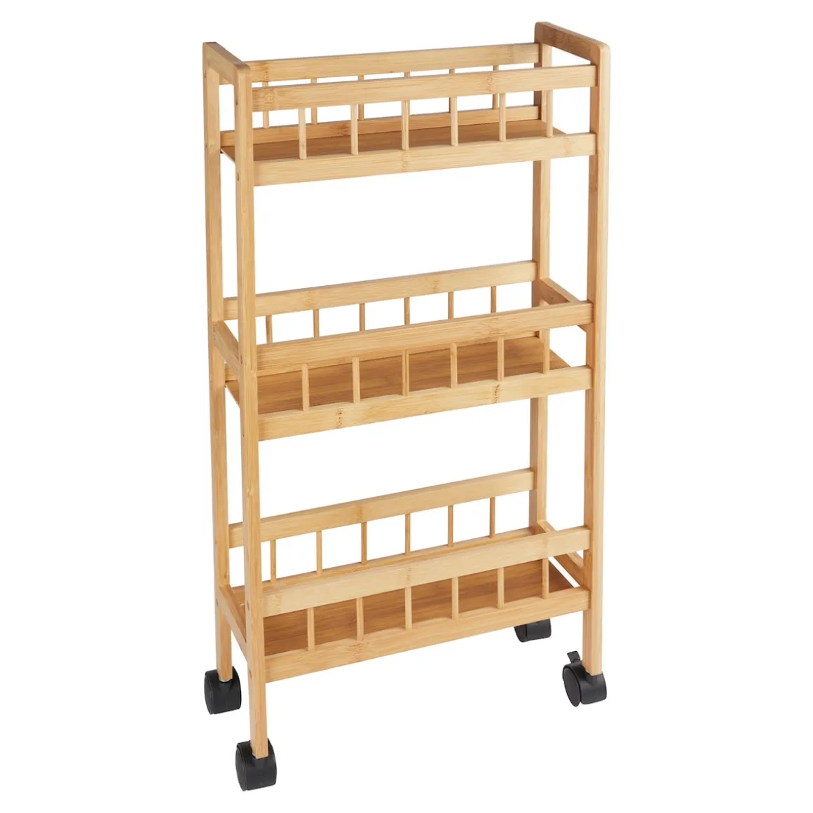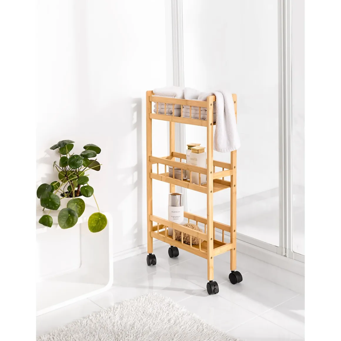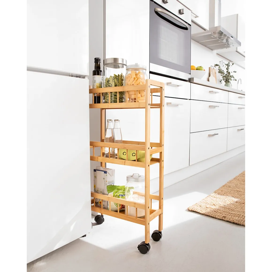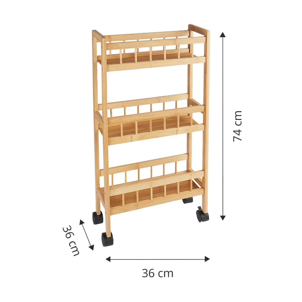 Das stabile Bambusdesign verleiht dem Rollwagen nicht nur eine natürliche Optik, sondern sorgt auch für eine hohe Tragfähigkeit. Dieser Wagen trägt nicht nur zur Ordnung in Ihrer Küche bei, sondern kann auch im Badezimmer oder anderen Räumen flexibel eingesetzt werden.