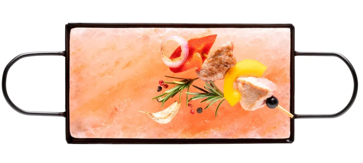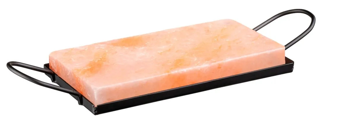 Der hochwertige Koch- & Grill- Salzstein von Mäser ist das ideale Zubehör für Backofen und Grill, um leckere Fleisch- und Fischgerichte mit einem ganz besonderen Salzaroma zu versehen. Bei der Zubereitung von Speisen auf dem Salzstein im Ofen oder auf dem Grill bekommen diese schon während des Kochvorgangs ein angenehmes Salzaroma. Der Salzblock besteht aus hochwertigem Gourmet Steinsalz, welches aufgrund seiner Herkunft aus pakistanischem Gebirgsketten unter dem Namen „Himalayasalz“ bekannt ist. Mit seiner typischen rosaroten Farbe und mit seinem angenehmen Aroma kommt es weltweit zum kulinarischen Einsatz. Zur Anwendung wird die Salzplatte im trockenen Zustand langsam in Backofen oder bei indirekter Hitze auf dem Grill für ca. 20 Minuten erwärmt, um Rissbildung zu vermeiden. Zum Überprüfen der Temperatur können ganz einfach ein paar Wassertropfen auf den Stein gespritzt werden. Wenn diese sofort verdampfen, ist der Stein einsatzbereit. Der Salzstein eignet sich auch hervorragend zum Servieren und kann dabei mit dem passenden Halter leicht getragen werden. Auch kalte Gerichte und Desserts können auf dem Salzstein serviert werden. Dafür den Stein einfach für 30 Minuten in den Gefrierschrank legen. Reinigung und Pflege sind unkompliziert: Der Salzstein wird dazu im kalten Zustand mit einem feuchten Lappen oder weichen Schwamm abgewischt. Fließendes Wasser, Spülmittel oder die Spülmaschine dürfen dabei nicht verwendet werden. Hartnäckige Verkrustungen können mit einem Schaber vorsichtig entfernt werden.