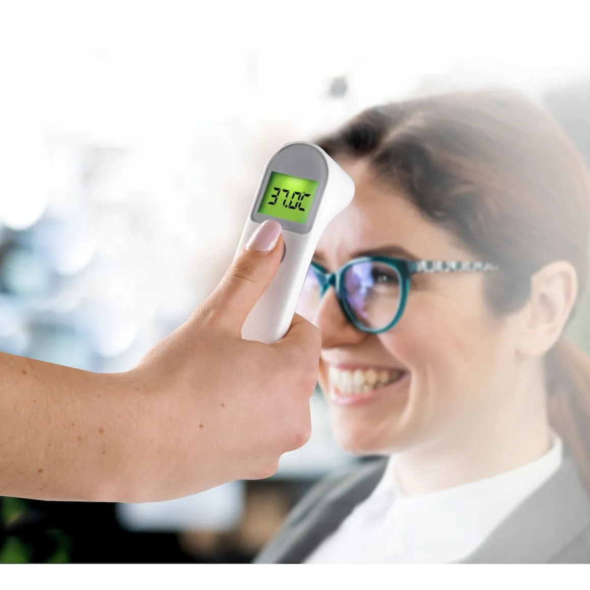 Kontaktloses Infrarot Fieberthermometer für die Messung der Gehörgangs- und Stirntemperatur. Zeigt Körpertemperaturen in 3 verschiedenen Farbcodes an. Mit Batteriewechselanzeige und Abschaltautomatik.