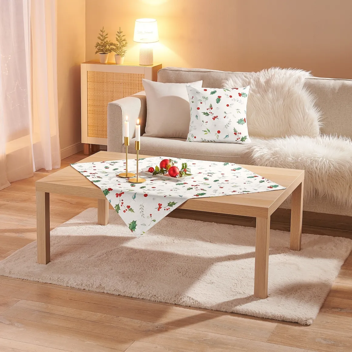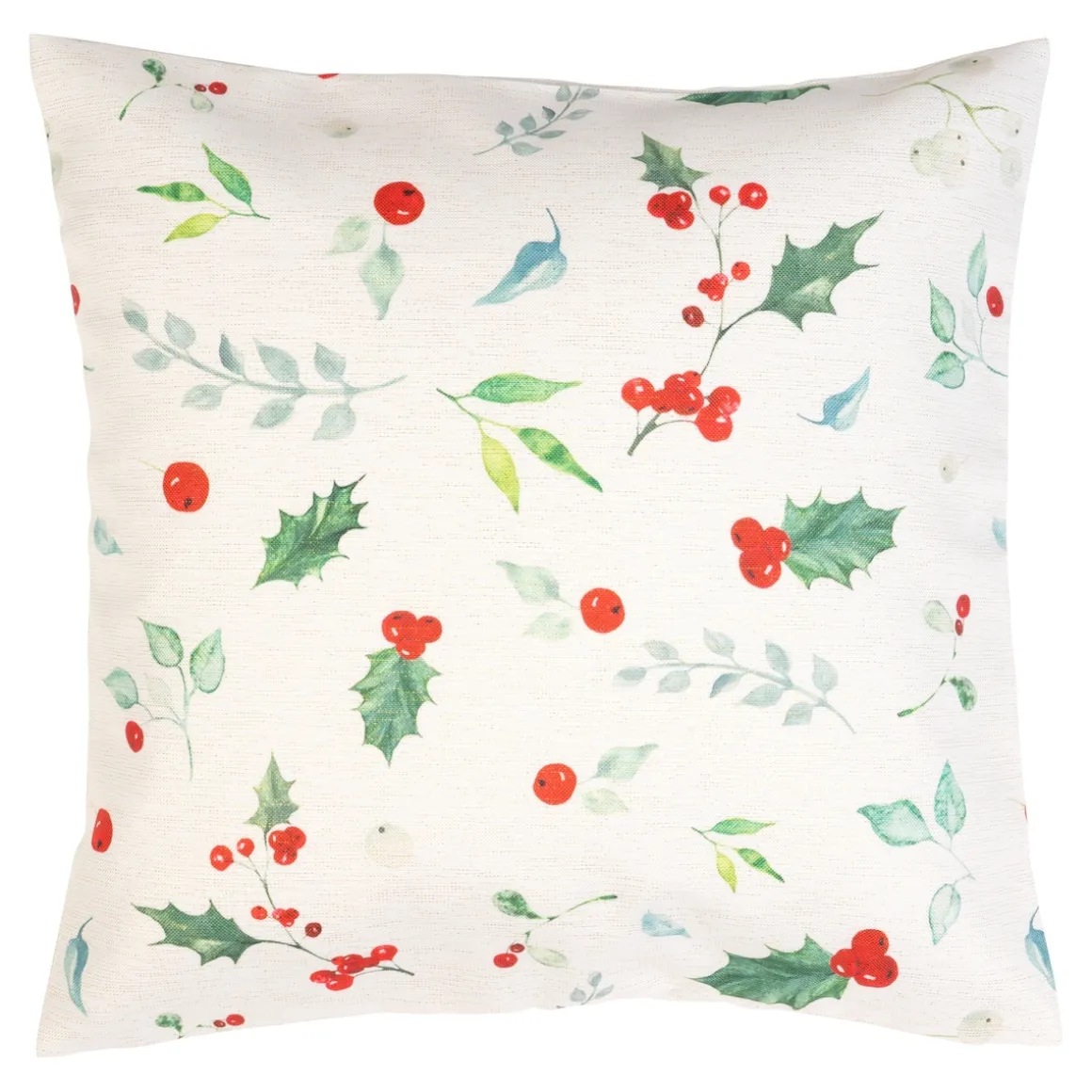 Leuchtend rote Beeren der Stechpalme, kräftig grünes Blattwerk und zarte Glitzerfäden – diese Kissenhülle bringt weihnachtliche Eleganz in Ihr Wohnzimmer. Mit unifarben weißer Rückseite und Reißverschluss.
