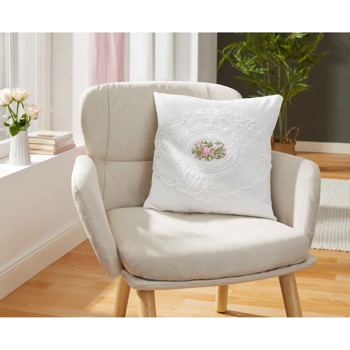 Diese Kissenhülle verleiht Ihrem Zuhause ein Gefühl von königlichem Flair. Mit filigraner Rosenstickerei und einer zart gearbeiteten Spitzenborte bringt sie nostalgische Eleganz in jeden Wohnraum. Das aufwendig gestaltete Design erinnert an klassische Salons vergangener Zeiten – ein stilvoller Blickfang auf Sofa, Sessel oder Bett. Gönnen Sie sich diesen Hauch von Luxus und lassen Sie Ihr Heim in neuer Pracht erblühen.