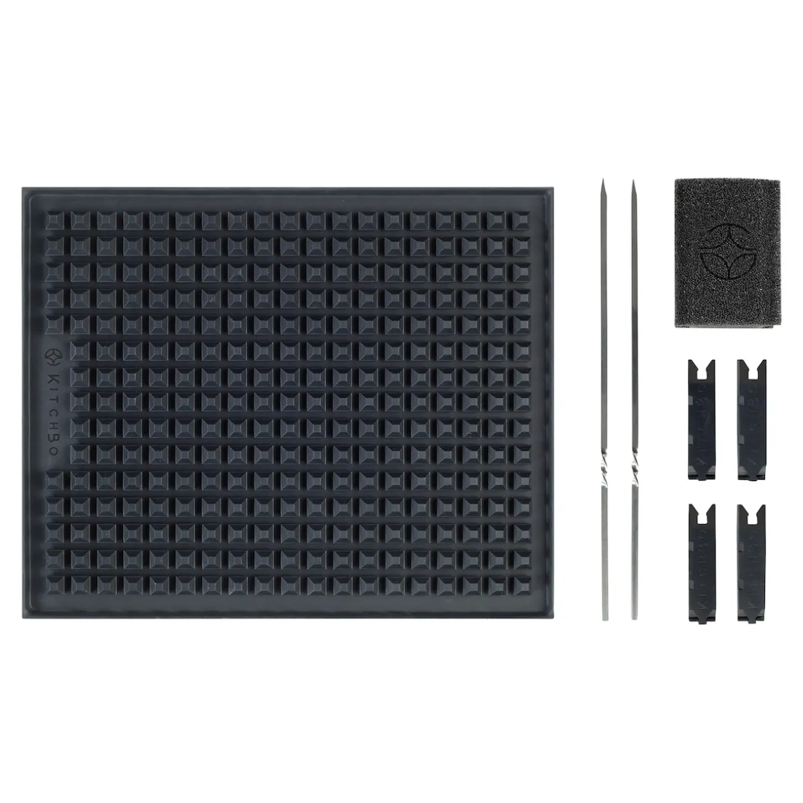 Im Lieferumfang enthalten: 1 x KitchBo Silikon-Backmatte, 4 x Klickstein, 2 x Edelstahlspieß, 1 x Reinigungsschwamm.