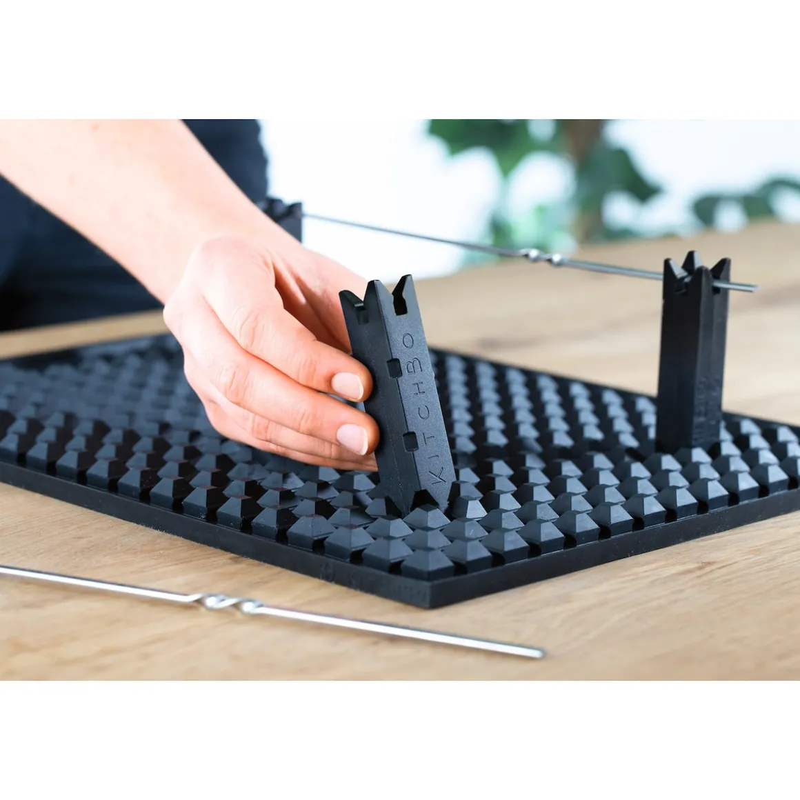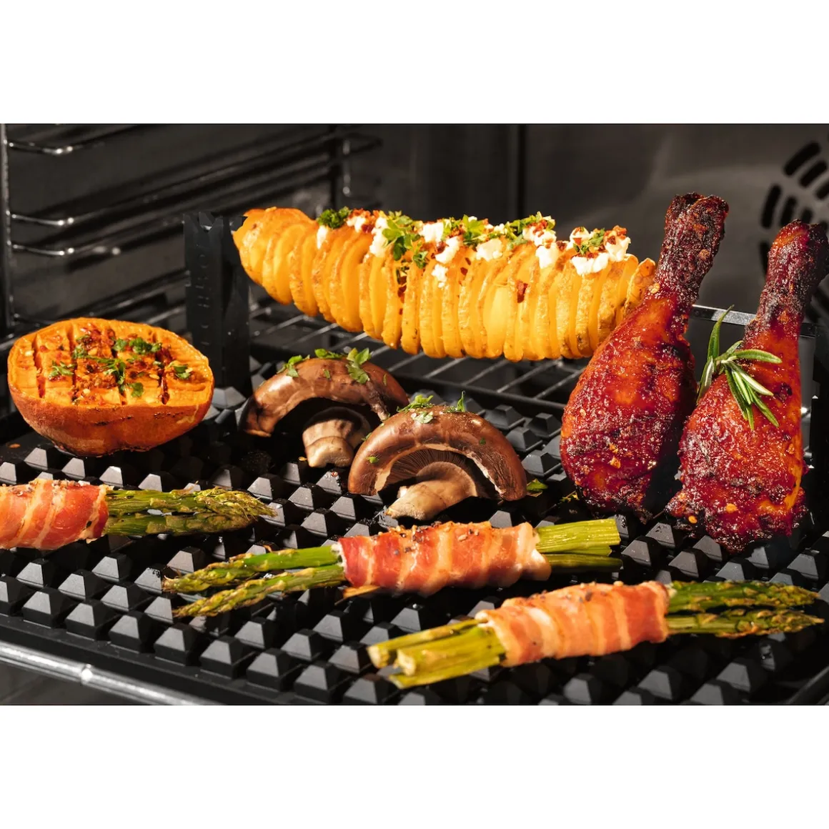 Mit dem KitchBo Silikon-Backmatte Starter Set wird das Zubereiten von Pommes, Fisch, Geflügel, Paprika und vielem mehr zum Genuss. Die Silikon-Backmatte ist mit 280 kleinen, etwa 1 cm hohen Pyramidennoppen ausgestattet, die dafür sorgen, dass die Backofenhitze die Lebensmittel von allen Seiten erreicht und gleichmäßig gart. Gleichzeitig laufen herabtropfendes Fett und Flüssigkeiten in die Vertiefungen der Matte ab, wodurch die Lebensmittel nicht im eigenen Saft schwimmen und eine knusprig-krosse Kruste erhalten. Dank der mitgelieferten Klicksteine kannst du deinen Backofen um eine zusätzliche Garebene erweitern und noch mehr Köstlichkeiten zubereiten. Die beiliegenden Edelstahlspieße finden auf den Klicksteinen Platz und ermöglichen eine zusätzliche Garebene.