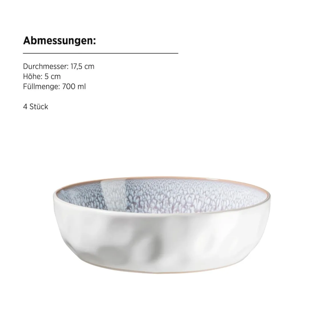 Mit der stilvollen Serie ELEA bringen Sie modernes, harmonisches Flair auf Ihren Esstisch. Die Außenseite in weißer Hammerschlagoptik bildet einen spannenden Kontrast zur türkisfarbenen Reaktivglasur im Inneren – jedes Teil erhält so eine einzigartige Handmade-Optik mit Unikatcharakter.
