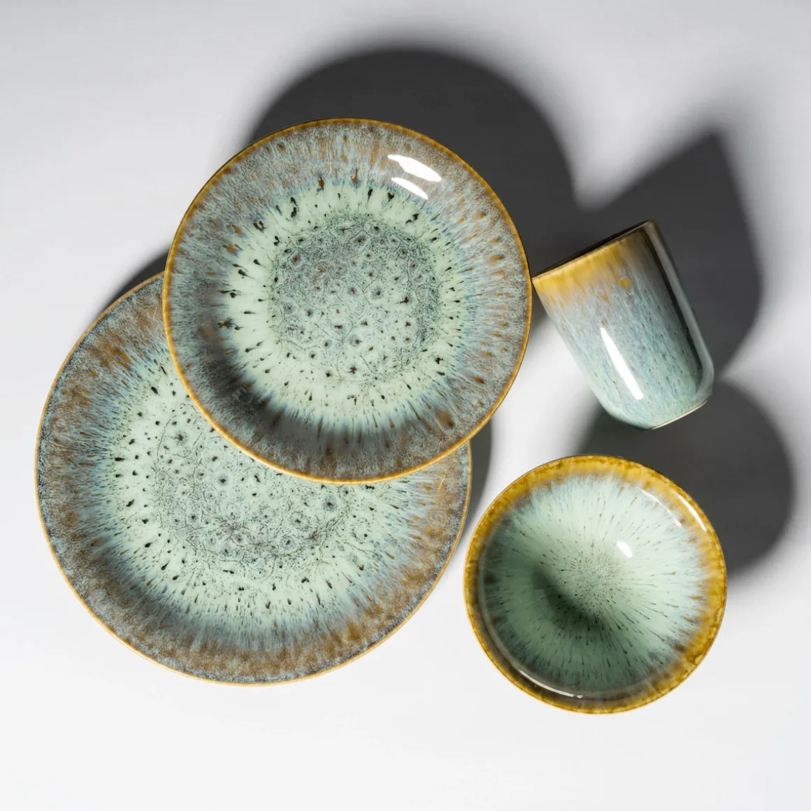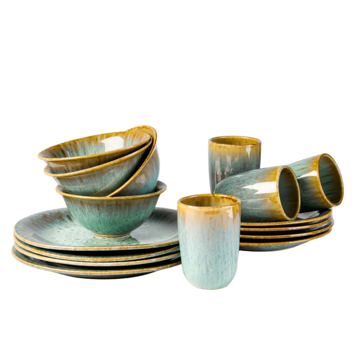 Die Keramik-Geschirr-Serie „Flussufer“ der österreichischen Marke Gipfelstück bringt die Schönheit der Alpen auf Ihren Esstisch. Inspiriert von einem Bergfluss, dessen klares Wasser sich seinen Weg durch grüne Täler und moosbewachsene Steine bahnt, beeindruckt das hochwertige, modern geformte Geschirr-Set durch seinen besonderen Farbverlauf von braun und grün zu blau. Dank der glänzenden, mehrstufig aufgetragenen Reaktivglasur ist jedes Keramikteil ein handgemachtes Einzelstück; aus europäischer Produktion hergestellt in Portugal. Das aus robustem Steinzeug gefertigte, einzigartige Keramikgeschirr ist mikrowellen- und spülmaschinengeeignet und somit auch alltagstauglich und pflegeleicht. Dieses Geschirrset wird klimaneutral in einer auf Bruchsicherheit getesteten Paketversandverpackung aus ressourcenschonenden Materialien versendet. Um eine objektive Vergleichbarkeit zu gewährleisten, gehen unsere Füllmengenangaben von einer randvollen Befüllung aus.