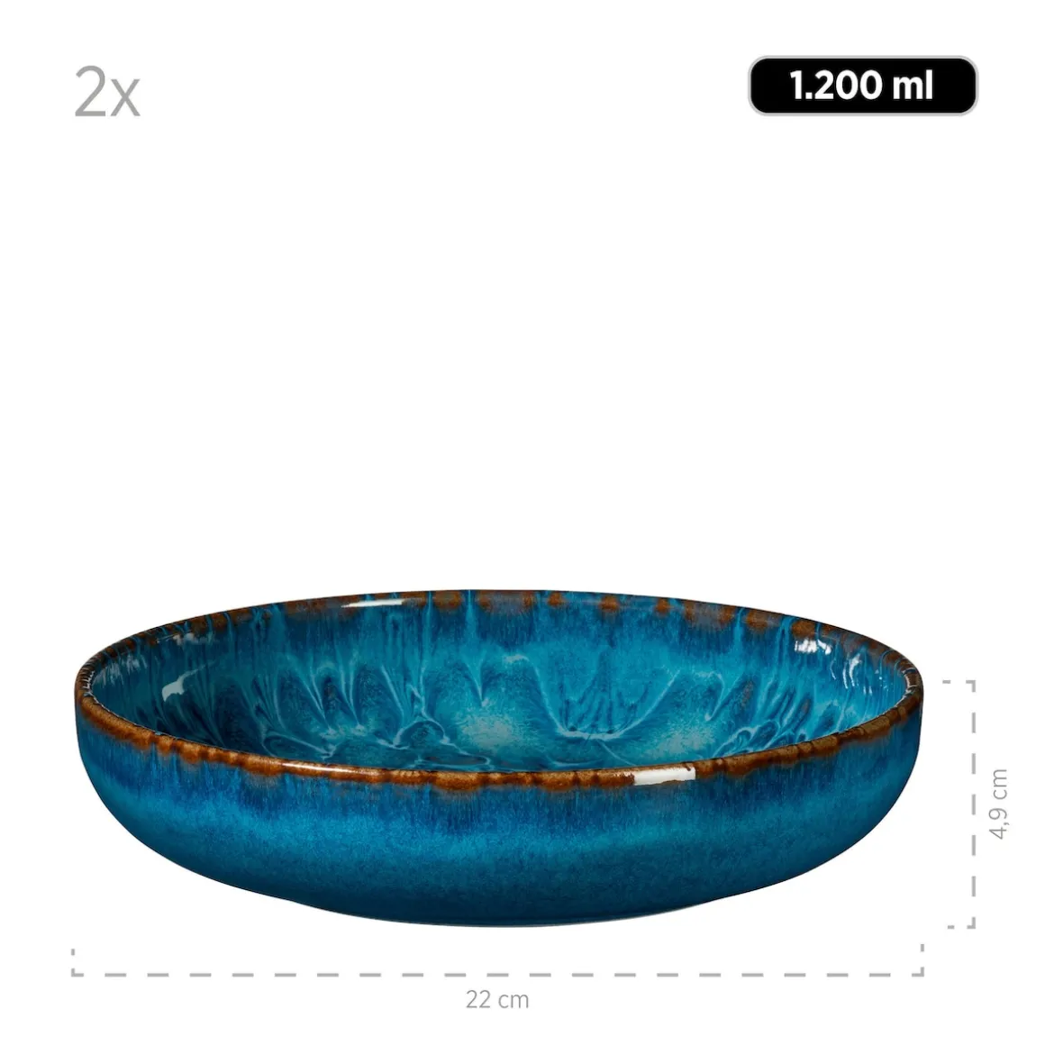 Wenn traditionelle portugiesische Azulejo-Ornamente auf magische Reaktivglasuren treffen, entstehen einzigartige Werke von fesselnder Schönheit. Die unter ressourcenschonenden Bedingungen in Portugal hergestellte Keramikgeschirr-Kollektion „Tiles“ der Traditionsmarke MÄSER transportiert die jahrtausendealte Faszination maurischer Kunst, welche durch eine besondere Glasurtechnik auf jedem Teil von unterschiedlich fließenden Farbverläufen umspielt wird. Besonders gut zur Geltung kommen die inspirierten Dekore dieser Geschirrserie durch die elegant-reduzierte und zugleich großzügige Formgebung der Teller und Schalen. Der Clou: Ganz nach Ihrem Geschmack entscheiden Sie sich zwischen selbstbewussten, dickwandigen Scandi-Formen mit umlaufendem Steg oder grazileren, abgerundeten Coupe-Formen mit geringerem Gewicht und Platzbedarf in Spülmaschine und Küchenschrank. Für welchen Formstil auch immer Sie sich entscheiden: Mit der Tafelgeschirr-Kollektion „Tiles“ hinterlassen Sie nicht nur einen bleibenden Eindruck bei Ihren Gästen, sondern verwandeln auch jede Ihrer Mahlzeiten in einen wahren Augenschmaus. Die Serie „Tiles“ ist aus Steinzeug gefertigt – einer hochwertigen Form der Keramik, die nicht mit dem brüchigeren und poröseren Steingut zu verwechseln ist. In seiner täglichen Handhabung unterscheidet sich hochwertiges Steinzeuggeschirr kaum von Porzellangeschirr: Die gesamte Serie ist mikrowellen- und spülmaschinengeeignet, hitzebeständig und tiefkühlgeeignet und damit absolut alltagstauglich. Dieses Service Set wird in einer vielfach auf Bruchsicherheit getesteten Paketversandverpackung aus ressourcenschonenden Materialien versendet. Bitte beachten Sie: Durch die besondere Glasurtechnik können minimale Unebenheiten in der Glasur auftreten, ebenso tragen Farbabweichungen zwischen verschiedenen Teilen zum typischen, lebendigen Charakter dieser Kollektion bei. Zur besseren objektiven Vergleichbarkeit gehen unsere Füllmengenangaben stets von einer randvollen Befüllung aus.