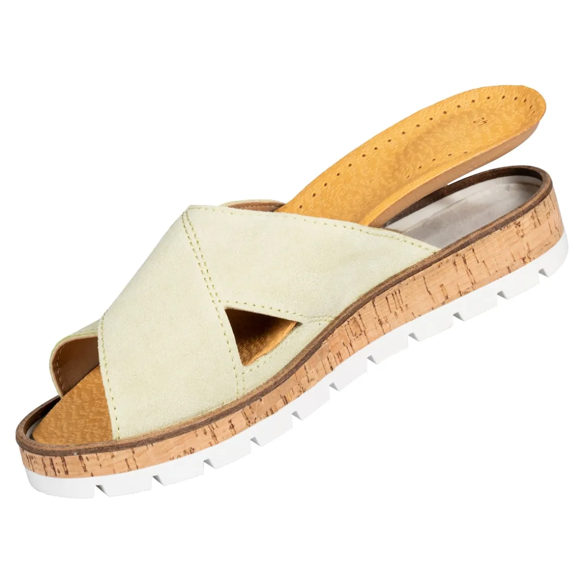 Unterstützung an 4 Stellen für eine anatomisch korrekte Haltung. 1. Fersensporn-Polster reduzieren den Druck. 2. Längsgewölbe-Stütze für einen natürlichen Bewegungsablauf. 3. Spreizfuß-Pelotten stützen den Ballenbereich. 4. Hammerzeh-Stege beugen Druckstellen vor. Die korkähnliche Korkfant-Dämpfung ermöglicht ein langes Gehen oder Stehen ohne Schmerzen. Aus Echtleder, leicht, elastisch, hautfreundlich – für ein gutes Fuß-Klima.