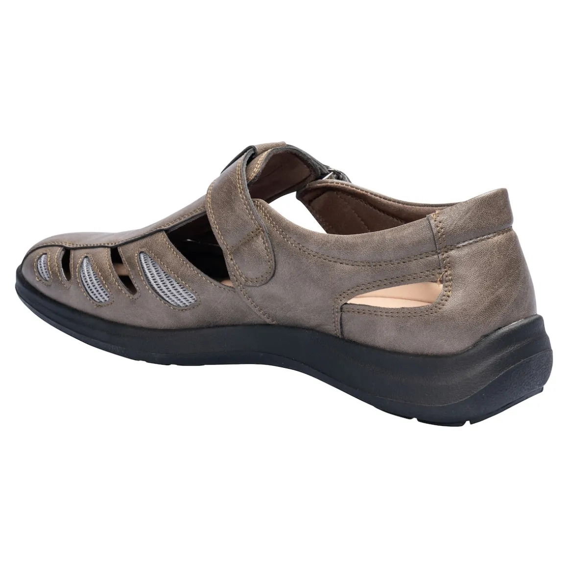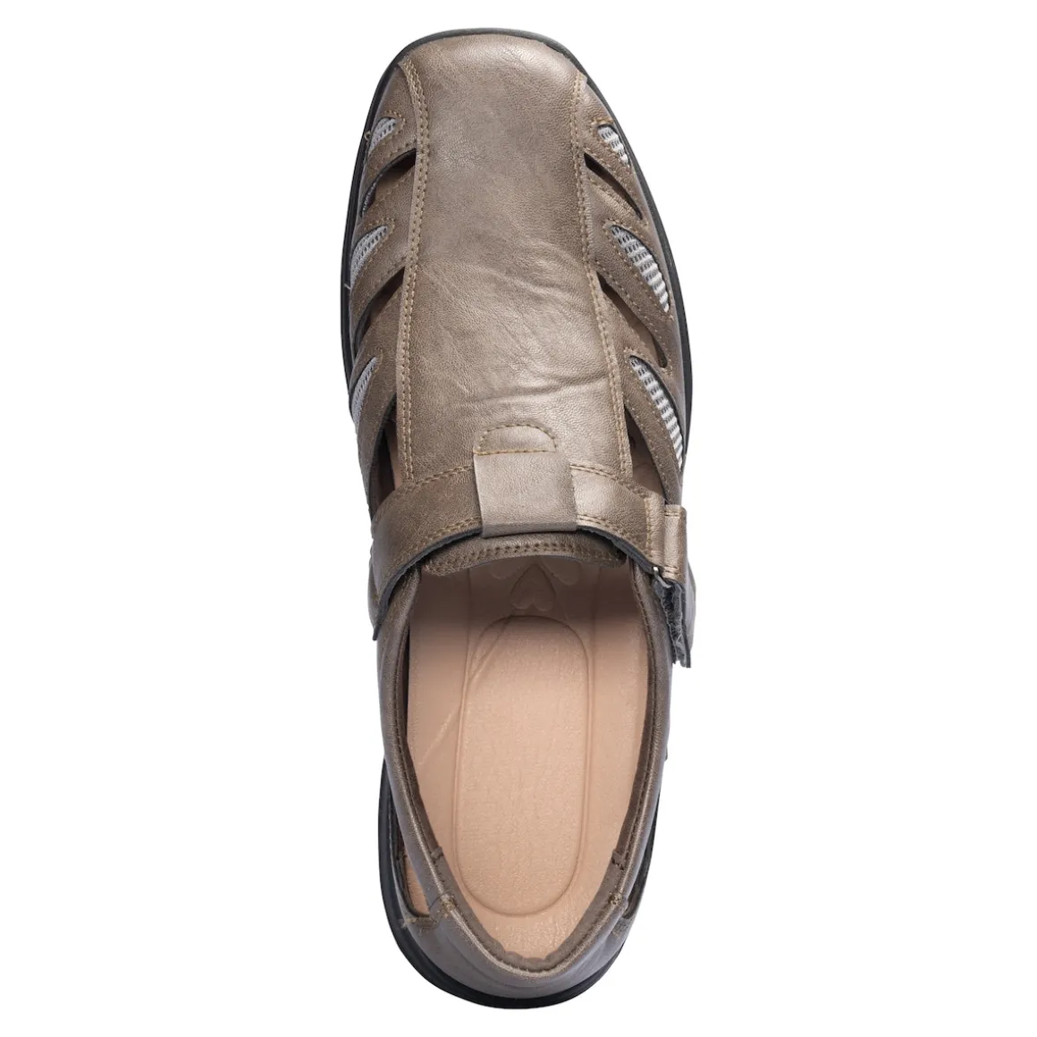 Luftig und locker gehen Sie mit dieser Herrensandale in schicker Leder-Optik durch die warme Jahreszeit. Der praktische Klettverschluss garantiert einen sicheren Halt und ermöglicht Ihnen einen leichten Ein- und Ausstieg. Die weiche, herausnehmbare Einlegesohle und die Laufsohle sorgen für ein angenehmes Trage- und Gehgefühl.