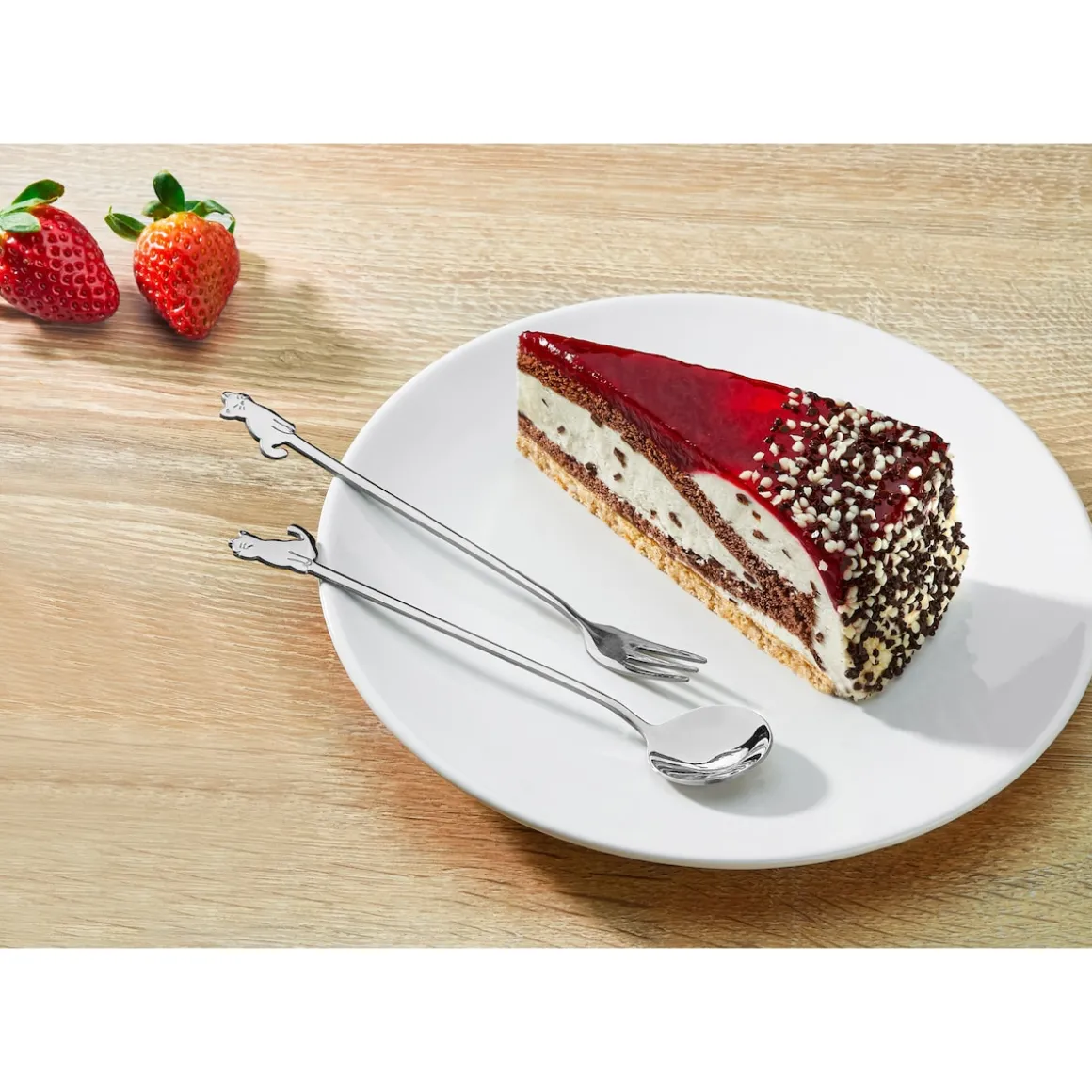 Verzaubern Sie Ihr Kaffeekränzchen mit einem Schnurreffekt, mit unserem Kuchenbesteck im niedlichen Katzendesign. Der liebevoll gestaltete Teelöffel und die Kuchengabel sind einzigartige Hingucker und praktische Begleiter für Kuchenliebhaber. Genießen Sie jeden Bissen in Gesellschaft der süßen Katzenmotive und machen Sie Ihr Kaffeekränzchen zu einem unvergesslichen Erlebnis.