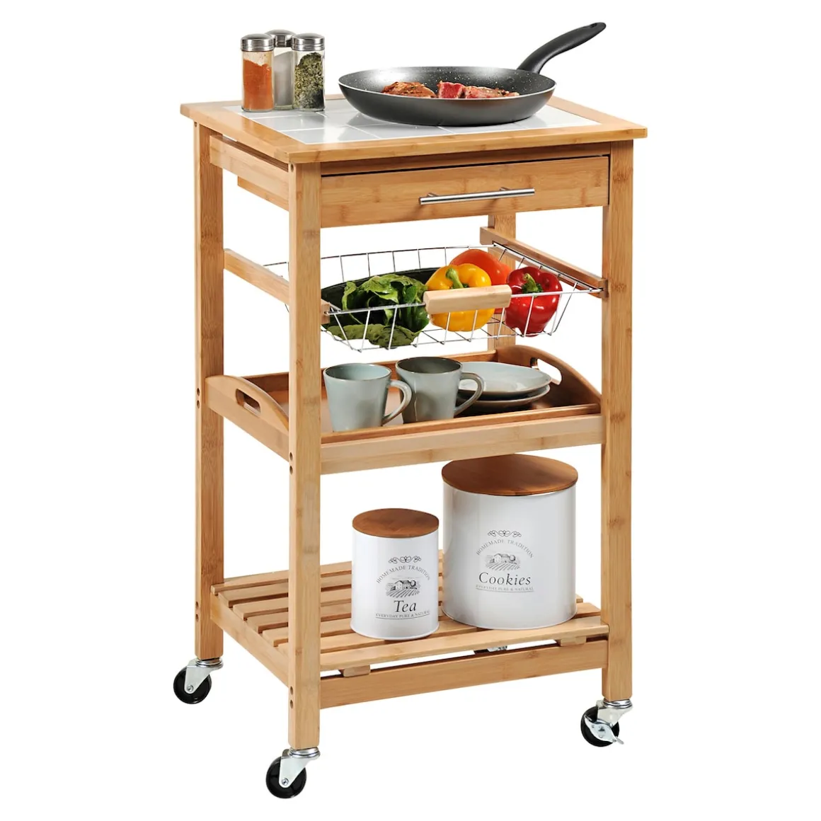 Die Besonderheit bei diesem Küchenwagen liegt in erster Linie in seiner Herstellung, denn hierfür wurde FSC-zertifizierte Bambus verwendet, welches die Nachhaltigkeit unterstützt. Aber auch die ausziehbare Platte, die sich unterhalb der hitzebeständigen Fliesen befindet, birgt seine Vorteile. Sie bietet zusätzliche Arbeits- oder Abstellfläche, um Speisen zu servieren oder kurz noch etwas zuzubereiten. Das ausziehbare Element ist bereits mit einem Handgriff ausziehbar und kann bei Nichtbedarf nahezu unsichtbar wieder hinein geschoben werden.