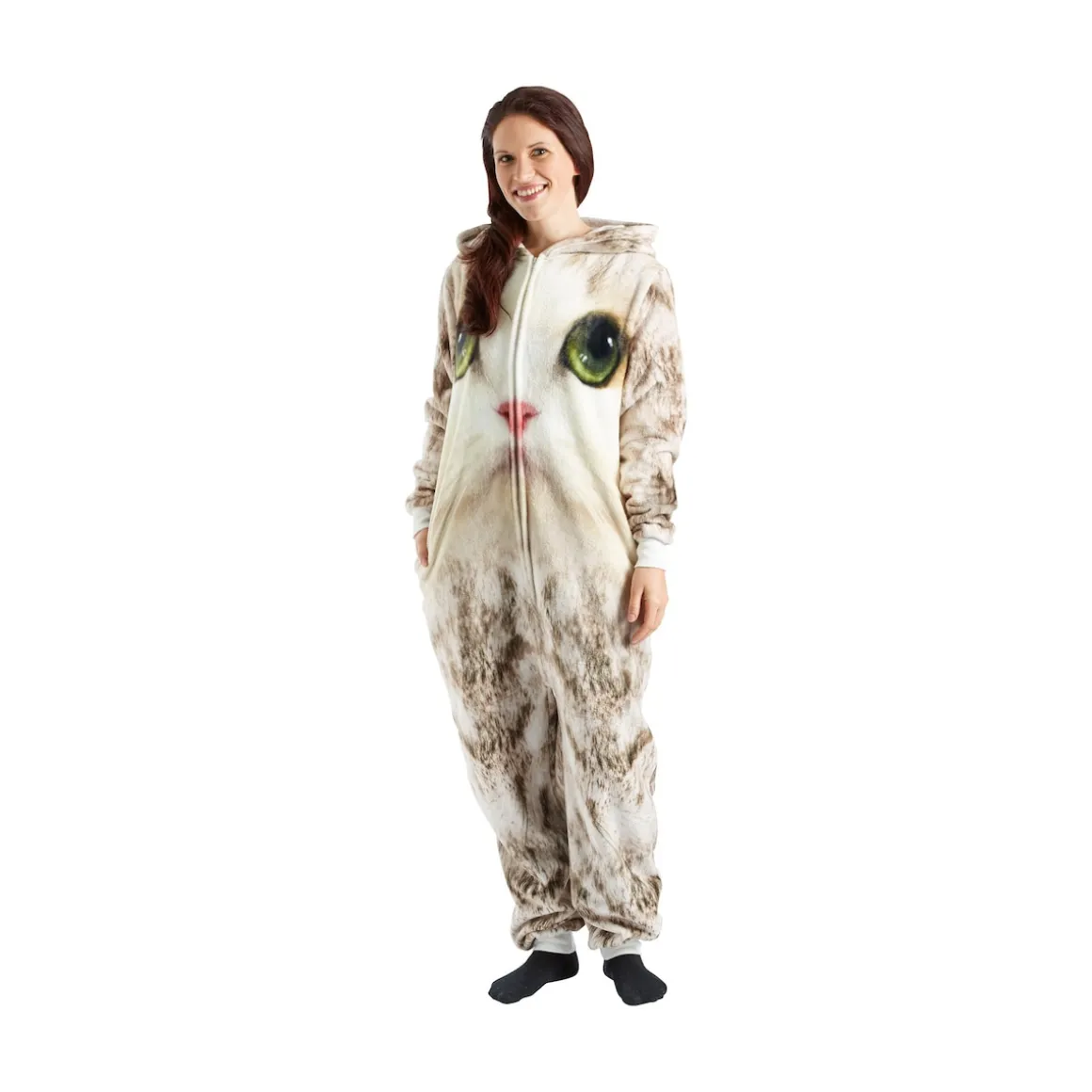 „Komm, mein Kätzchen, kuscheln!“ Diese Aufforderung werden Sie ab sofort öfter hören. Witzig, pfiffig, kuschelig – einfach einzigartig. Ein ungewöhnlicher Hausanzug mit Katzenfell-Druck und einem Katzengesicht im vorderen Bereich. Mit Reißverschluss vorne und seitlichen Eingriffstaschen!