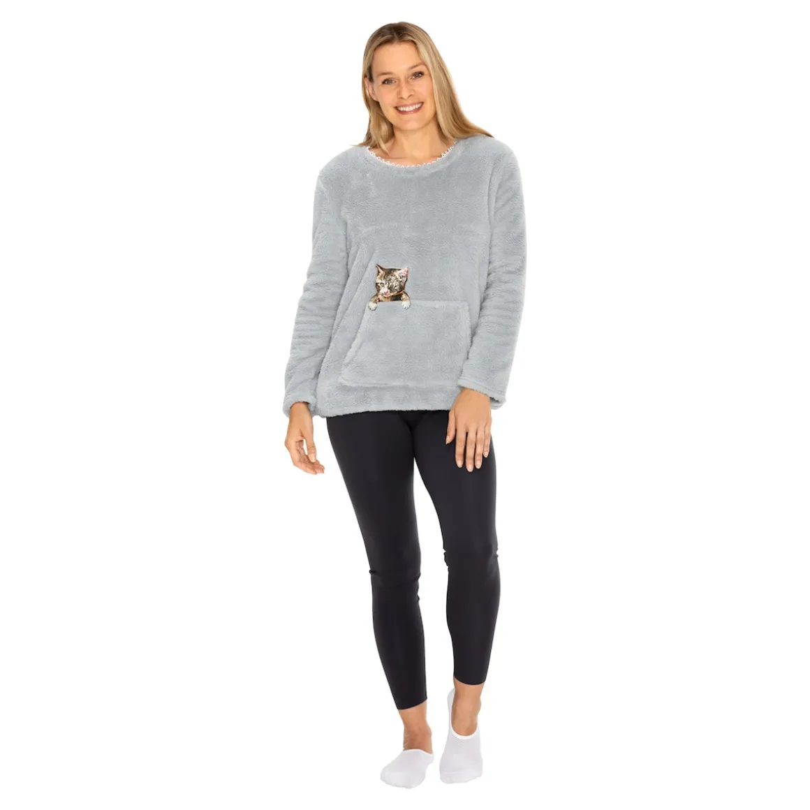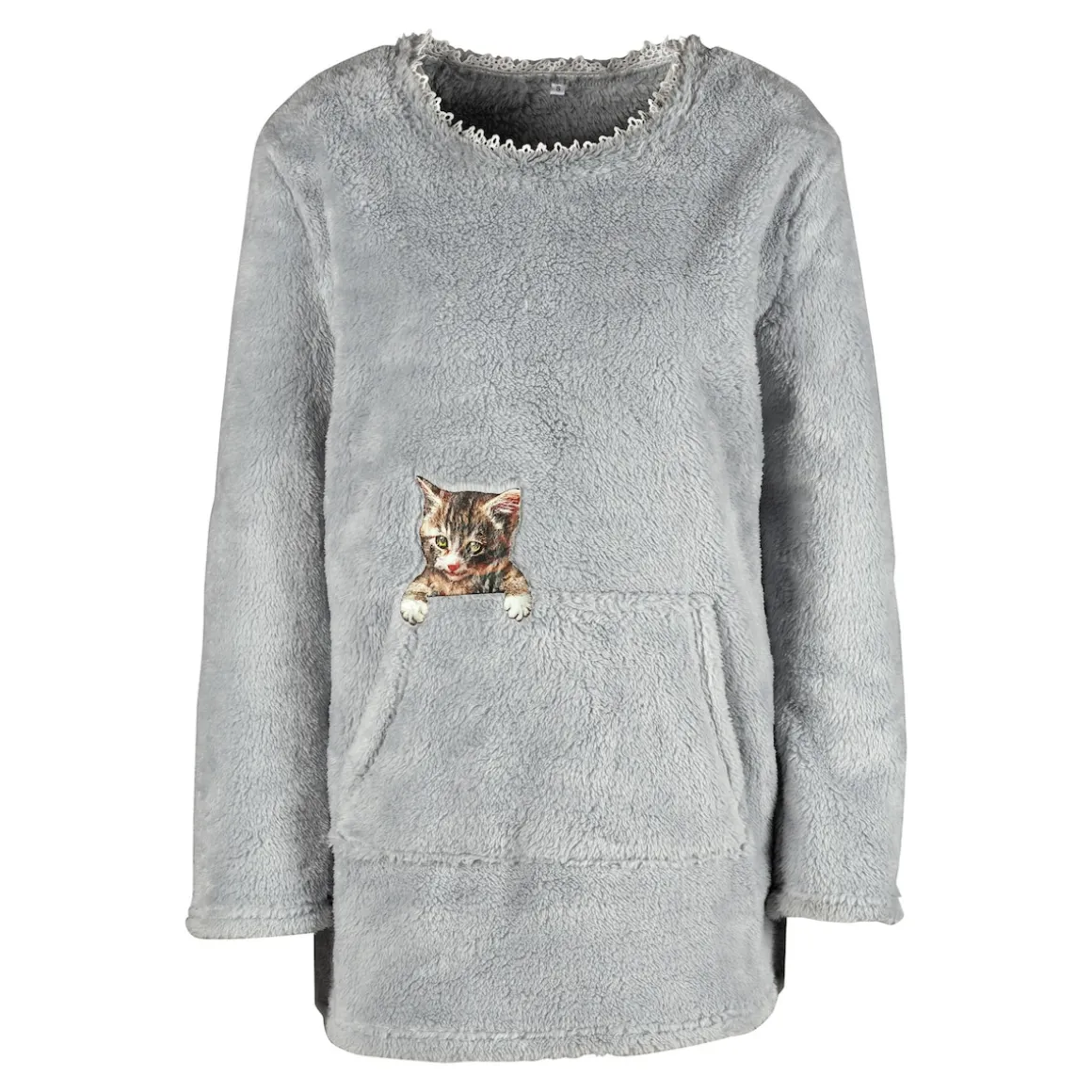 Traumhaft weich und kuschelig warm: Dieser Fleecepullover mit zauberhafter Spitzenborte am Rundhalsausschnitt ist genau das Richtige, um es sich daheim gemütlich zu machen. Die praktische Kängurutasche krönt ein kleines Kätzchen, das verspielt hervorlugt.