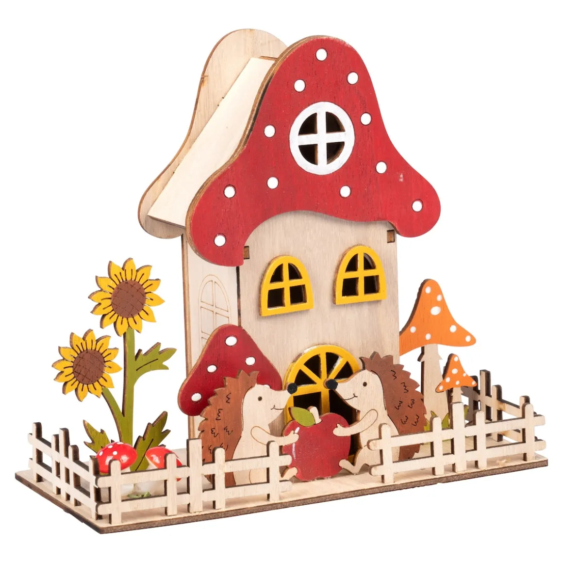 Bevor sich die 2 niedlichen Igel zur Winterruhe begeben, lassen sie es sich noch einmal so richtig schmecken. Sollte ihr Mahl etwas länger dauern, schalten Sie einfach das LED-Licht an – schon erstrahlt das Haus im warmen Schein.