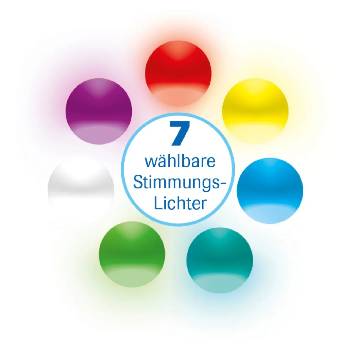 Wie stark das Gebläse kühlt, lässt sich individuell einstellen. Dazu stehen am Gerät insgesamt drei Geschwindigkeits- und Kühlstufen zur Auswahl. Für das richtige Wohlfühlambiente ist das Klimagerät zusätzlich mit farbigen LED-Stimmungslichtern ausgestattet. Sie hüllen den Raum abends oder nachts in ein gemütliches Licht. Zur Auswahl stehen sieben Farben (Blau, Rot, Weiß, Blaugrün, Violett, Gelb, Grün) und ein automatischer Farbwechselmodus.