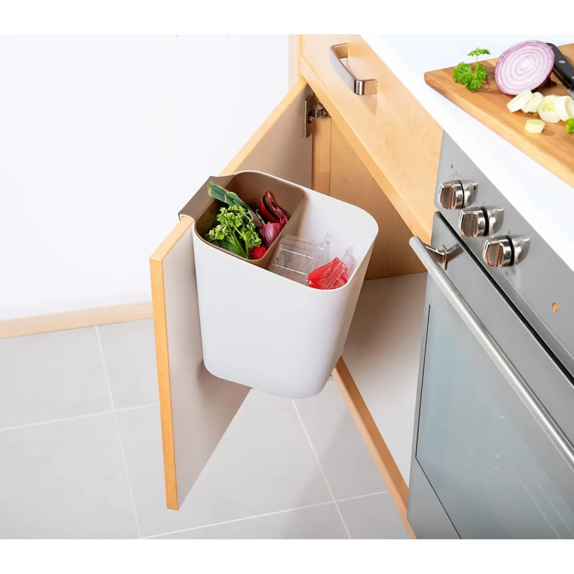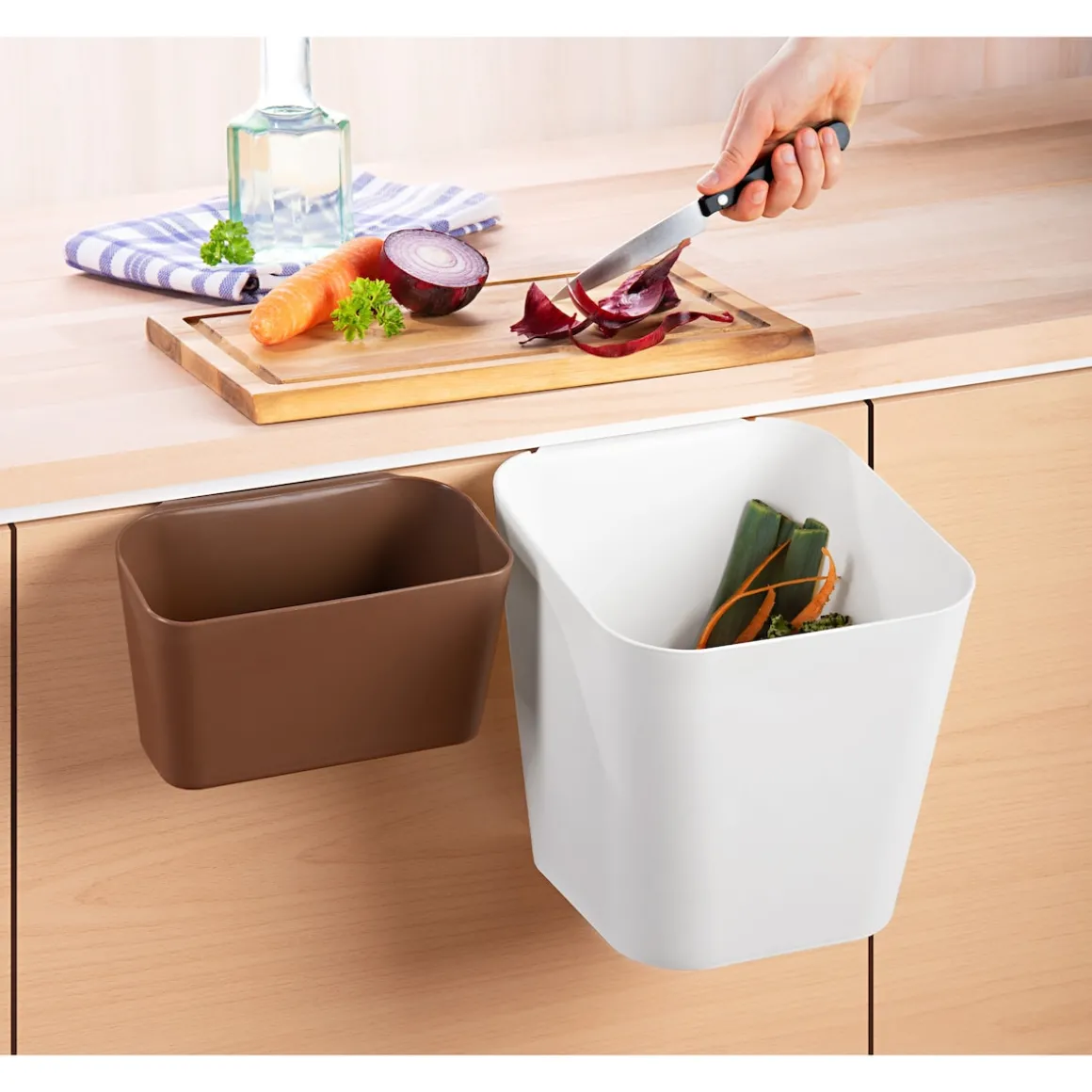Eine ideale Möglichkeit zur Mülltrennung bieten diese beiden Boxen: Einfach in die Schranktür eingehängt, lässt sich Biomüll & Co. ordentlich trennen. Auch praktisch zur Aufbewahrung von Spülmitteln, Schwämmen, Spülbürsten & Co.