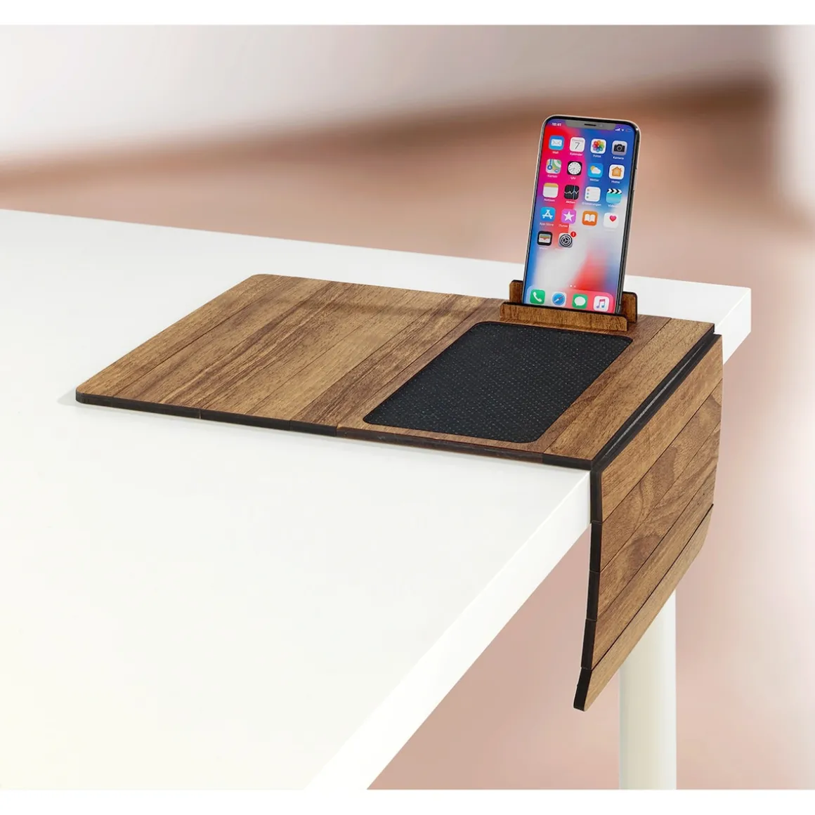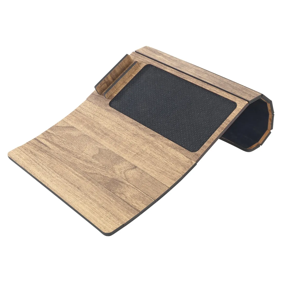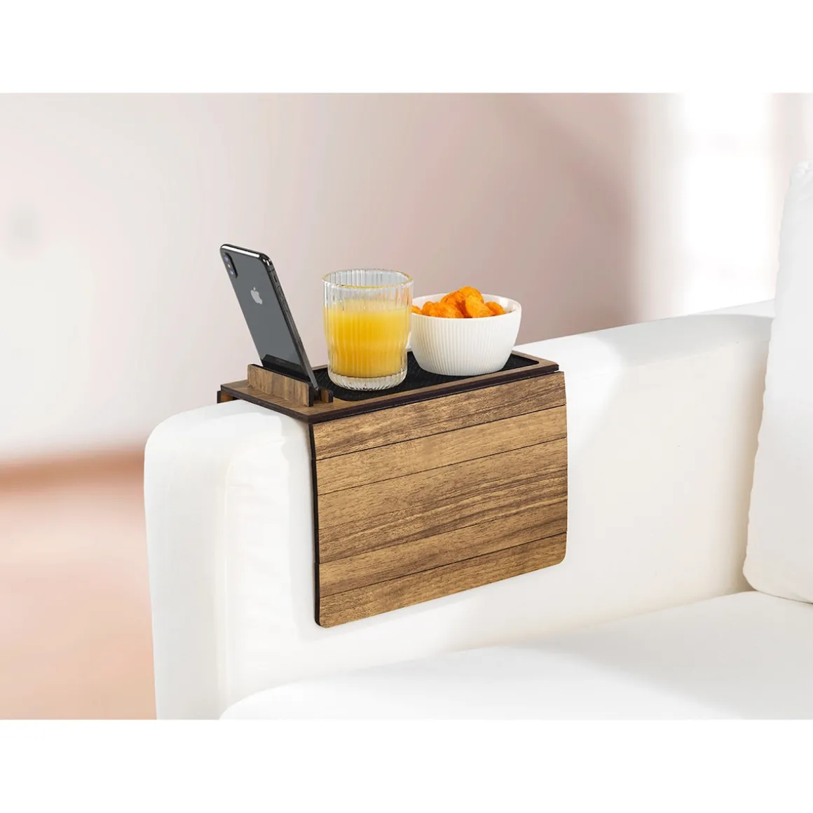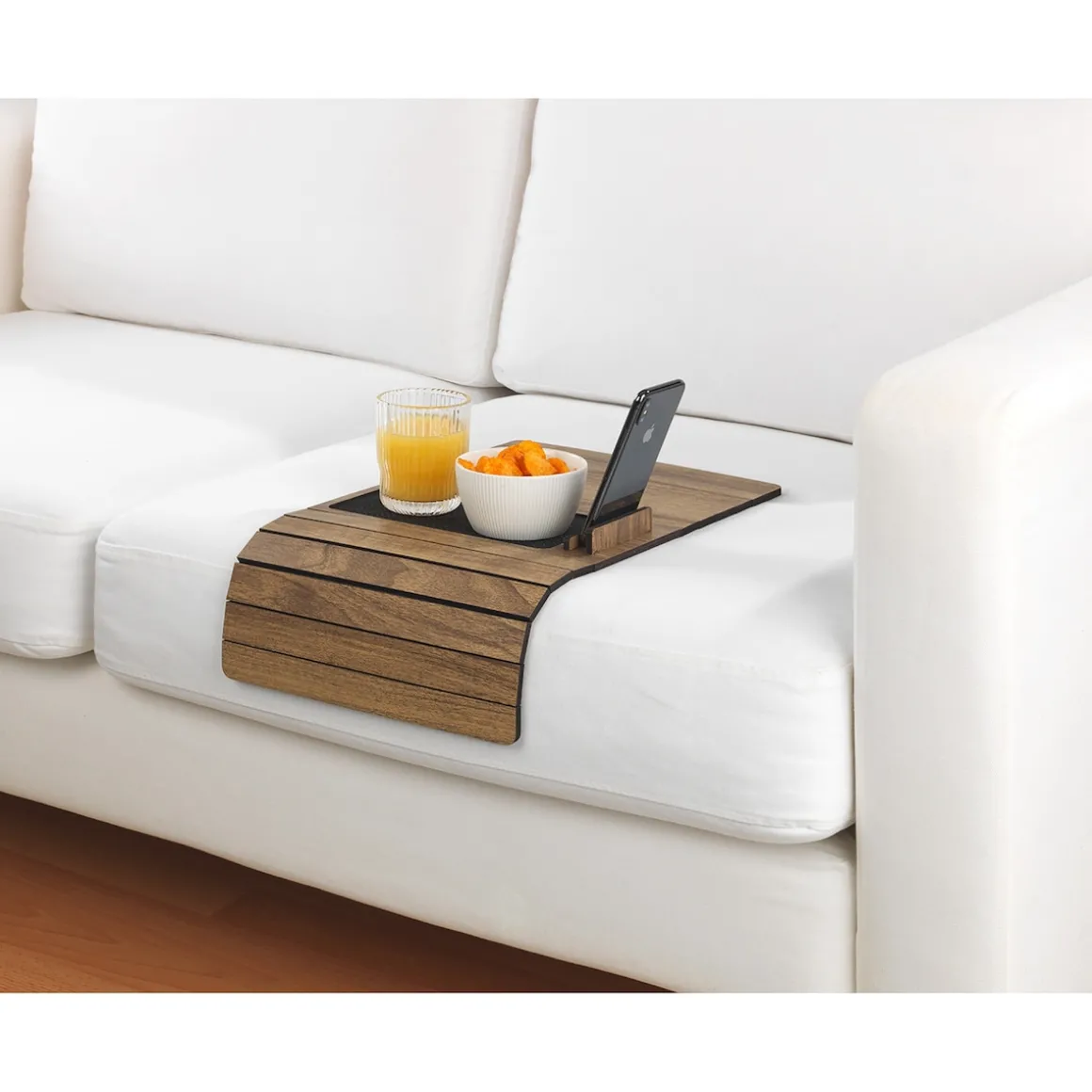 Ob auf der Couch, im Bett oder im Sessel – die Multifunktions-Ablage hält Geschirr, Smartphone, Fernbedienung sicher und zuverlässig. 13 flexible Elemente schmiegen sich perfekt um Sofarundungen oder Armlehnen. Abstellpad mit Antirutsch-Noppen und Handy-/Tablet-Halterung. Unterseite mit möbelschonendem Filz. In zeitloser Nussbaumoptik.