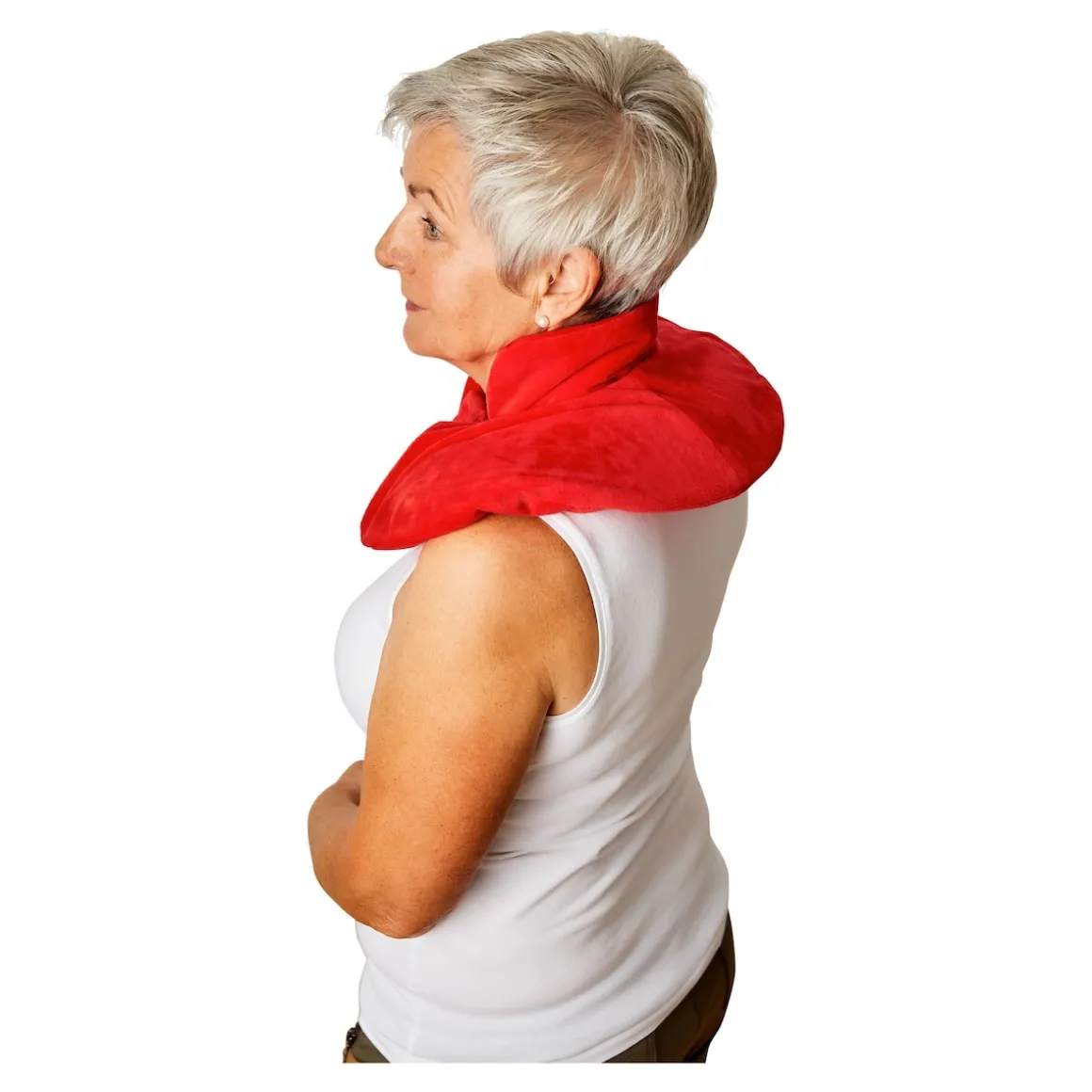 Dank Klettverschluss liegt die innovative Wärmflasche sicher auf den Schultern – ohne zu verrutschen. Der Stehkragen wärmt dabei Ihren Nacken.