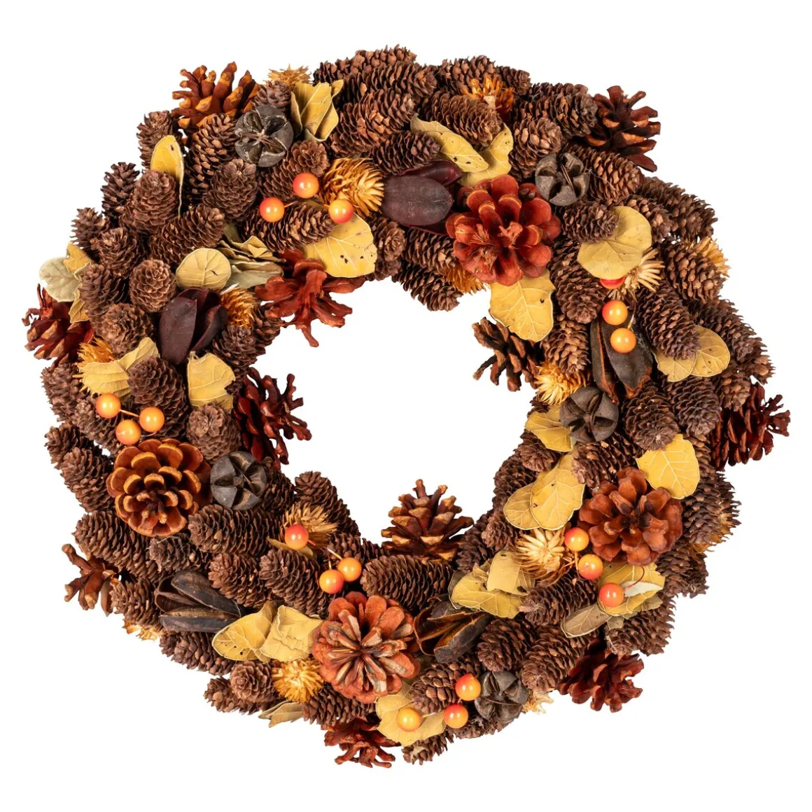 Entdecken Sie die Schönheit des Waldes mit diesem bezaubernden Naturkranz. Geschmückt mit Beeren, Zapfen und Herbstblättern, verleiht er Ihrem Zuhause eine einladende Atmosphäre, die den Herbst in all seinen Facetten zum Ausdruck bringt. Perfekt als Türkranz oder als Mittelpunkt auf der herbstlich gedeckten Tafel. Mit echten Kiefernzapfen.
