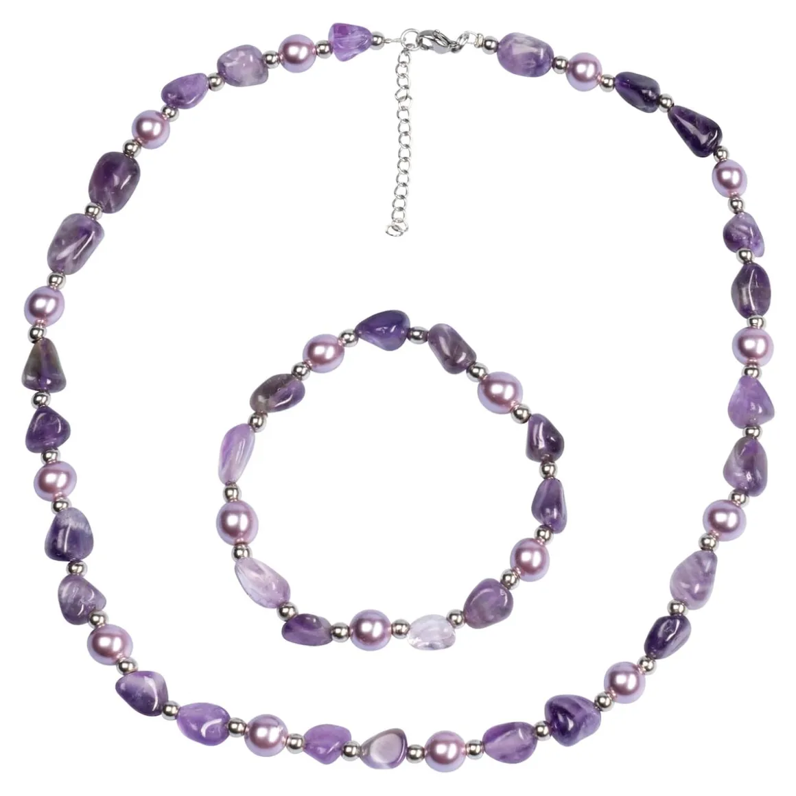 Die filigrane Kette und das passende elastische Armband bezaubern durch die Kombination aus Amethyst-Quarzen, Muschelkernperlen und versilberten Zwischenkugeln. Der Amethyst wird oft als „Stein der Ruhe“ bezeichnet und soll die Fähigkeit haben, Stress abzubauen und eine tiefe innere Gelassenheit zu fördern. Die Kette ist mit einem kleinen Karabiner versehen und längenverstellbar.