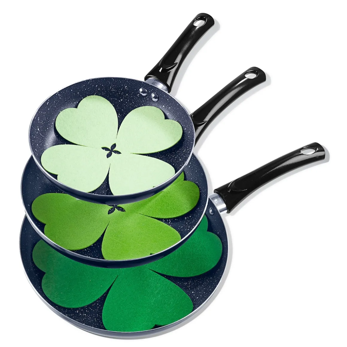 Diese praktischen Pfannenschoner im Kleeblatt-Design bringen nicht nur Ihren Pfannen Glück. Als Untersetzer schützen sie zudem Ihren Tisch vor heißen Töpfen. In 3 unterschiedlichen Größen.