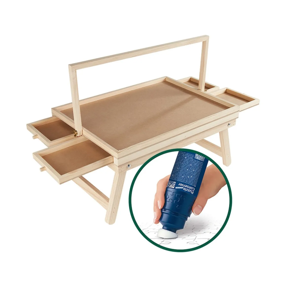 Mit dem Puzzletisch „Premium“ wird Puzzeln so komfortabel wie nie zuvor. Die klappbaren Beine machen den Tisch überall einsetzbar, egal ob Sie gemütlich auf dem Sofa, im Bett oder am Esstisch puzzeln möchten. Vier ausziehbare Schubladen bieten Ihnen die Möglichkeit, Puzzleteile übersichtlich zu sortieren und jederzeit griffbereit zu haben. Die verstellbare LED-Leiste sorgt für eine optimale Ausleuchtung, sodass Sie zu jeder Tageszeit perfekte Sicht auf Ihr Puzzle haben.
