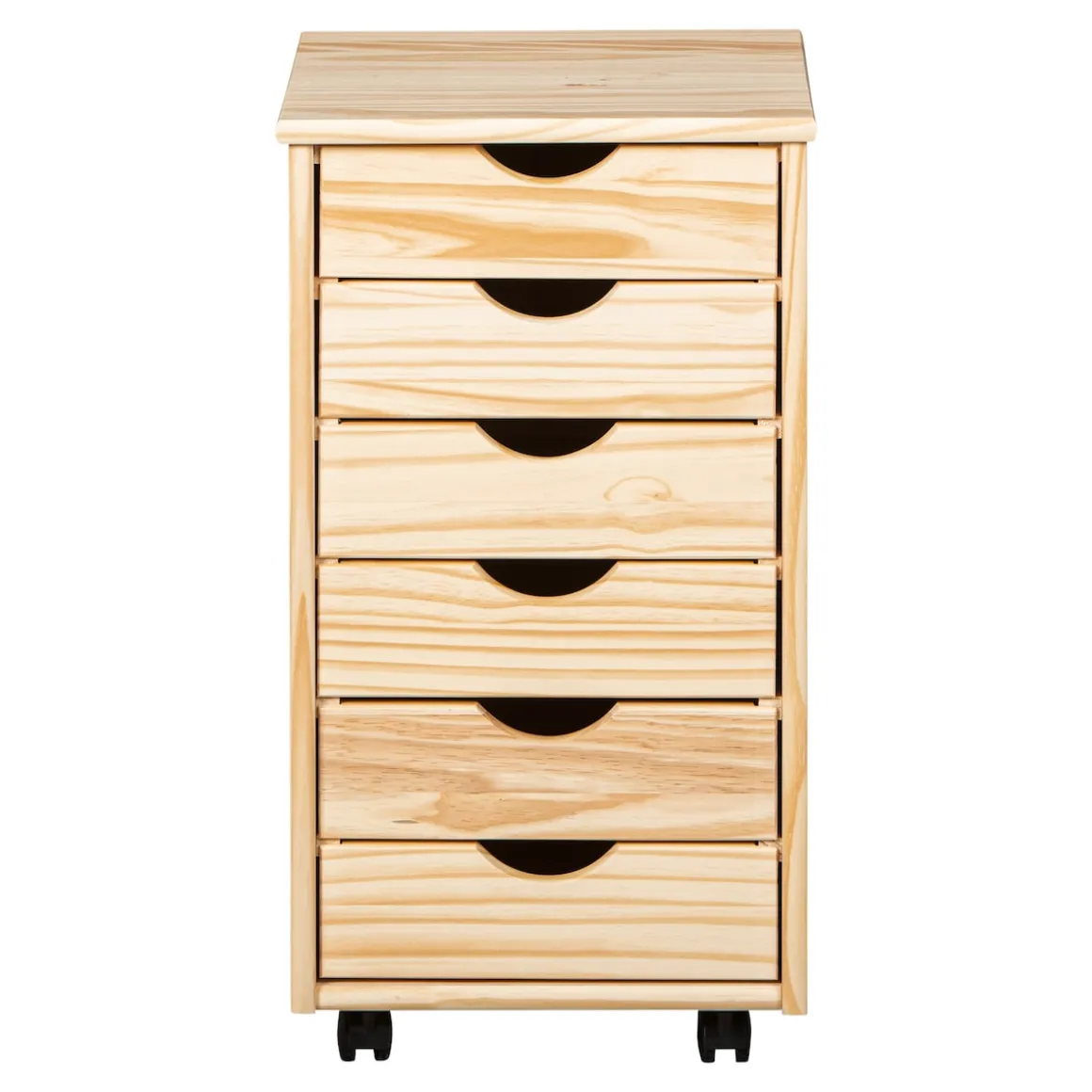 Dank seiner kompakten Maße findet der Rollcontainer überall einen passenden Platz. In kleinen Büros oder Arbeitszimmern lässt er sich sogar unter dem Schreibtisch platzieren, wo er keinen zusätzlichen Stellplatz in Anspruch nimmt. Aus Kiefernholz gefertigt ist der Container sehr stabil und die Schubladen lassen sich über die Aussparungen in der Mitte leicht öffnen. Sie sind voll ausziehbar, sodass ihr Inhalt komplett einsehbar ist – praktisch für alle, die viel unterzubringen haben.