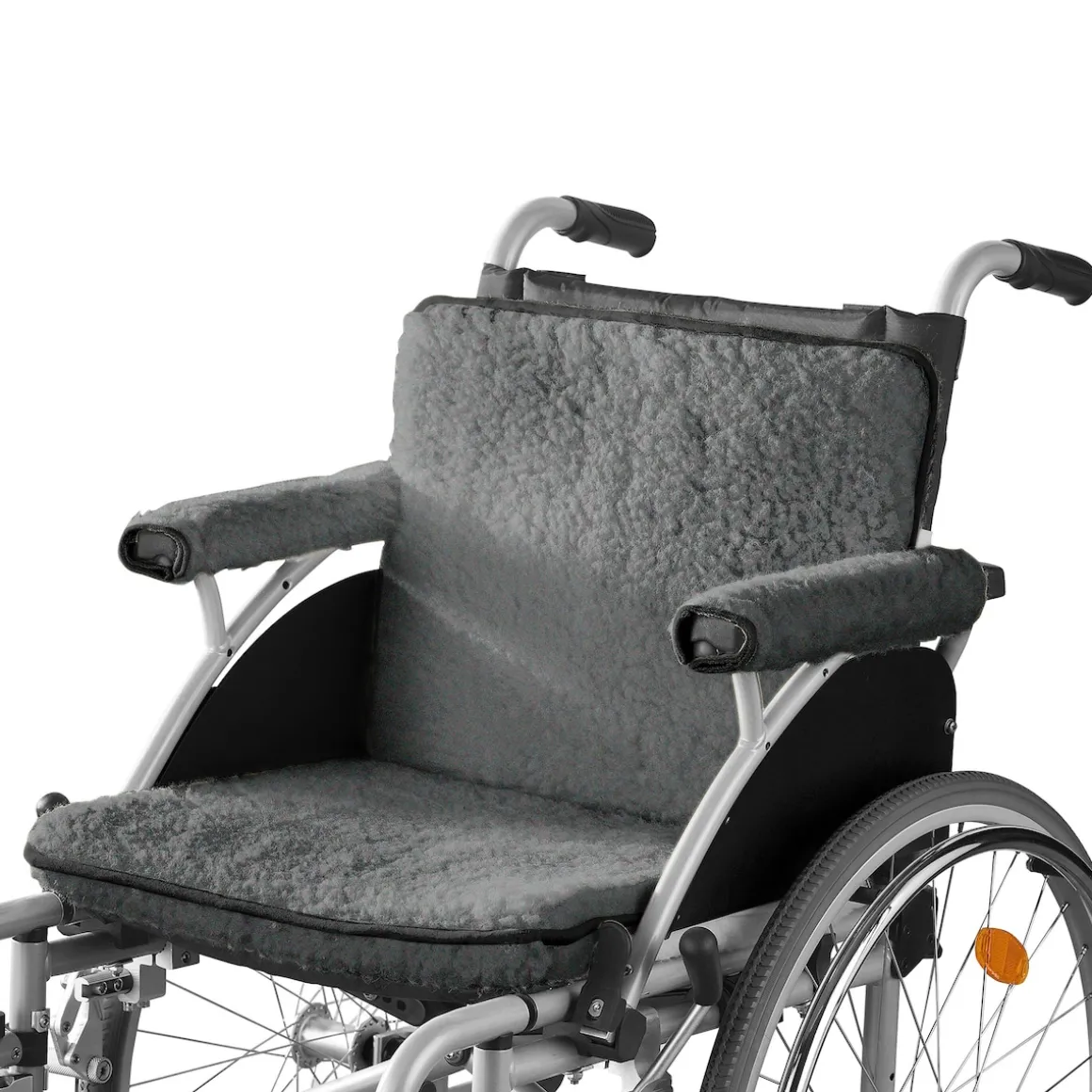 Der Schurwoll-Flor schützt gegen Kälte, der Schaumstoffkern polstert den Rollstuhl. Mit Gummiband an der Rückenlehne fixierbar. Beidseitig verwendbar. 1 Sitz-/Rückenteil und 2 Armauflagen mit variablem Klettverschluss. Armlehnen L: 30 cm.