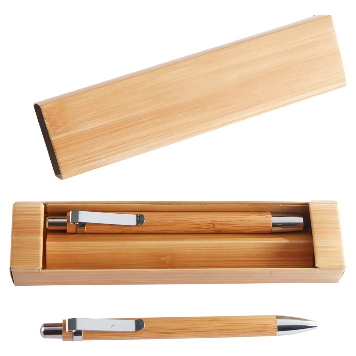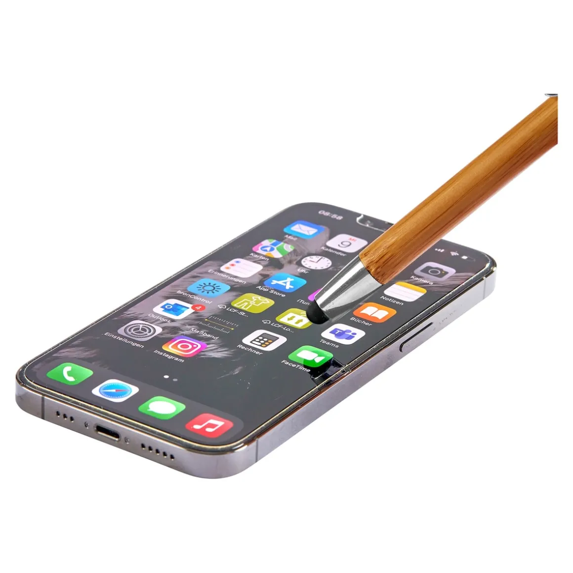 Blauschreibender Kugelschreiber mit Druckmechanismus und Touchscreen-Spitze sowie Druckbleistift mit elegantem Bambusschaft! Lieferung mit Box im Bambus-Design.