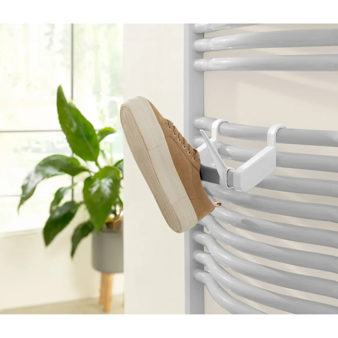 Mit diesem praktischen Schuhtrockner trocknen Sie Ihre Schuhe ganz einfach am Heizkörper. Die cleveren Haken nutzen die Wärme Ihres Rundheizkörpers, um nasse Schuhe schnell und effizient zu trocknen. So bleiben Ihre Schuhe stets trocken und Sie sparen Energie, ohne zusätzliche Geräte nutzen zu müssen. Ideal für die kalte Jahreszeit!