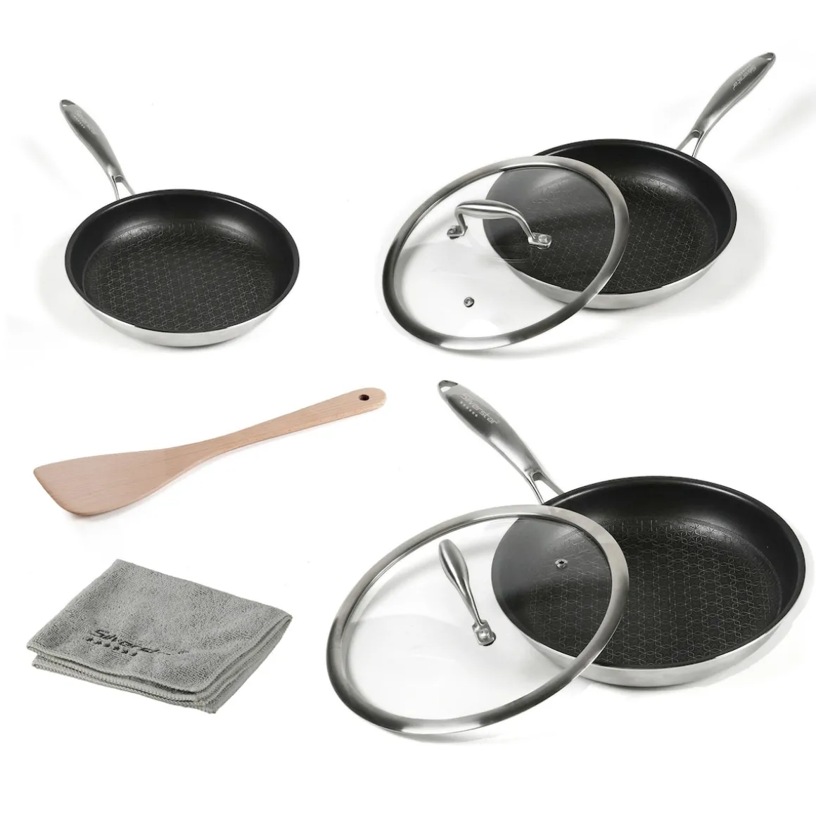 Silverstar Unzerstörbar! Patentiert! Professionell! Wenn es um die Pfanne für das perfekte Steak geht, ist das die erste Wahl: Die Profi Edelstahl Pfannen von Silverstar! Die patentierten Pfannen vereinen die besten Eigenschaften einer Edelstahlpfanne mit denen einer Antihaftpfanne. Wie das funktioniert? Der Pfannenkörper besteht aus dem Dreischicht-Material „Edelstahl – Aluminiumkern – Edelstahl“. Diese Materialkombination gewährleistet eine schnelle Erhitzung des Kochgeschirrs sowie eine perfekte und gleichmäßige Wärmeverteilung vom Pfannenboden bis zum Rand. Im letzten Produktionsschritt wird die Pfanne antihaftversiegelt. Es handelt sich dabei um eine 100 % unzerstörbare Innenboden-Beschichtung, die selbst Küchenhelfern aus Metall standhält. Grund dafür ist die spezielle Silverstar Antihaftbeschichtung mit erhöht gelegener Sterne-Struktur aus Edelstahl. Die filigrane Struktur bewirkt, dass Sie Ihr Steak oder Grillgemüse scharf und bei hohen Temperaturen wie in einer klassischen Edelstahlpfanne anbraten können. Gleichzeitig lässt die Antihaftversiegelung die Speisen leicht aus dem Kochgeschirr lösen. Ein punktgenaues und gleichmäßiges Bratergebnis ist damit garantiert. Durch die Sterne-Struktur ist die Pfanne außerdem unempfindlich gegen Kratzer und Abrieb. Die Pfannen sind bis zum Schüttrand antihaftbeschichtet, was ein einfaches Herausgleiten der Speisen auf den Teller garantiert. Die antihaftversiegelten Silverstar Edelstahlpfannen sind für alle Herdarten geeignet und können selbstverständlich auch auf Herden mit Induktion verwendet werden. Im Backofen hält das Material Temperaturen bis 220 °C stand. Also ab mit der Pfanne und dem gebratenen Gemüse in den Backofen zum Gratinieren. Hmmm … Und die Reinigung? Ist genauso unkompliziert wie die Handhabung, denn hier kommen die Vorzüge der Antihaftpfanne erneut zum Vorschein: die Pfanne einfach mit heißem Wasser, einem milden Spülmittel und einem weichen Schwamm auswischen. Das war’s! Mit dem im Lieferumfang enthaltenen Mikrofasertuch können Sie Ihre Pfanne wieder auf Hochglanz bringen. Dieses Set besteht aus: 1 Bratpfanne, ø ca. 20 cm, Höhe: ca. 4 cm, ca. 1 l 1 Bratpfanne, ø ca. 24 cm, Höhe: ca. 4,5 cm, ca. 1,6 l 1 Bratpfanne, ø ca. 28 cm, Höhe: ca. 5,5 cm, ca. 2,5 l 1 Glasdeckel, ø ca. 24 cm 1 Glasdeckel, ø ca. 28 cm 1 Pfannenwender aus Holz 1 Mikrofasertuch Die wichtigsten Vorteile auf einen Blick: Patentierte Edelstahlpfanne mit 100 % unzerstörbarer Innenbeschichtung dank Antihaftversiegelung mit Sterne-Struktur aus Edelstahl Robuster Pfannenkörper aus Dreischicht-Materialkombination Harte, kratzfeste und resistente Innenbeschichtung mit sehr langer Lebensdauer Ideal zum scharfen Anbraten, Kochen, Braten, Gratinieren, Backen Inklusive Mikrofasertuch für ein glänzendes Finish Leichte Reinigung dank Antihaftversiegelung Extra starker, verzugsfreier Boden Bodenstärke: 2,8 mm Für alle Herdarten geeignet, auch Induktion Backofengeeignet bis 220 °C Material: 3-Schicht-Kombination aus „Edelstahl, Aluminiumkern, Edelstahl“ mit Antihaftversiegelung Reinigungs- und Pflegetipps: Vor dem ersten und nach jedem Gebrauch empfehlen wir, Ihr Koch- oder Backgeschirr mit etwas Wasser und einem milden Spülmittel gründlich auszuwaschen. Achten Sie dabei darauf, dass der Artikel ausreichend abgekühlt ist, bevor Sie mit der Reinigung beginnen. Nicht mit kaltem Wasser abschrecken. Dank der Antihaftwirkung wird die Reinigung per Hand empfohlen.