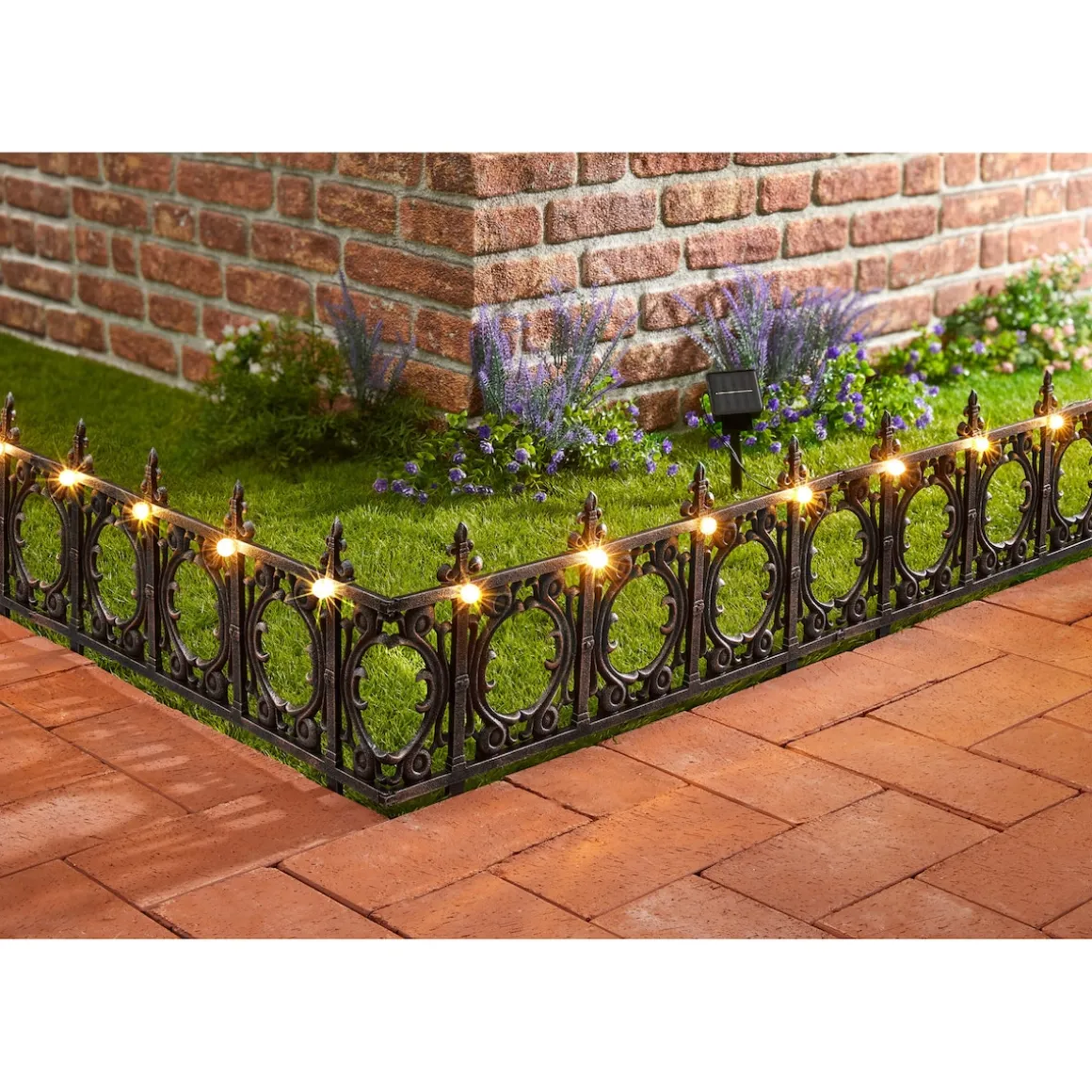 Gerade oder über Eck zusammengesteckt – mit dieser Begrenzung in edler Metall-Optik setzen Sie jedes Beet in Szene. Die integrierte Solar-Lichterkette schaltet sich ab Beginn der Dämmerung automatisch an und verschönert Ihren Garten im Nu mit stimmungsvollem Licht.