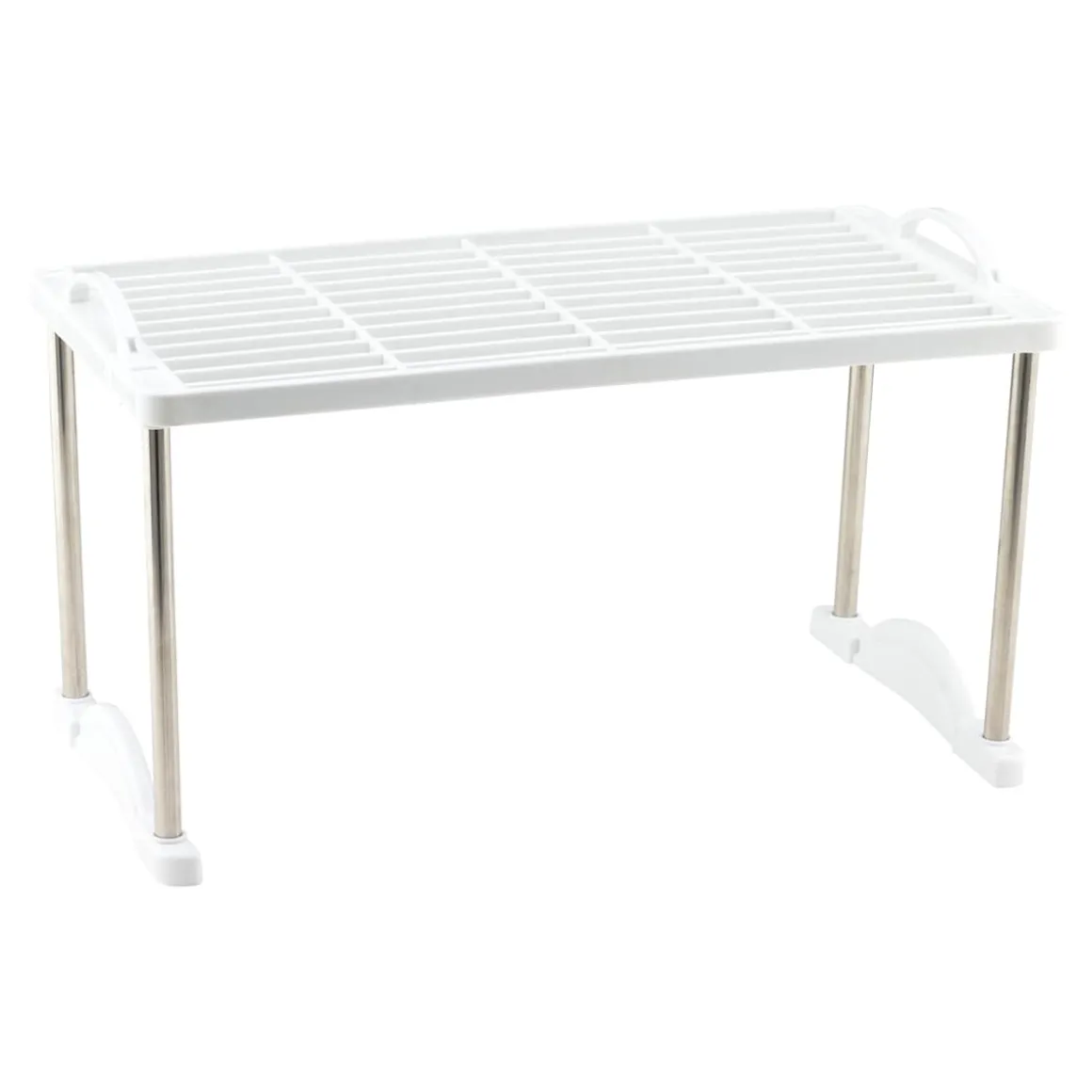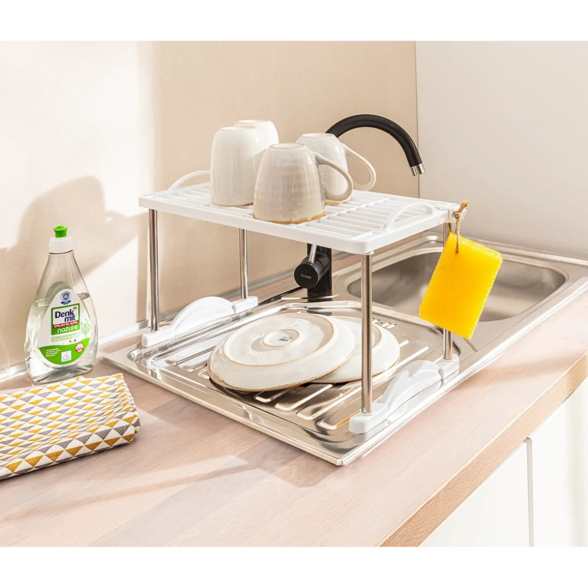 Sie haben eine kleine Küche? Mit diesem Regal, das auf den Spültisch passt, schaffen Sie in der Höhe zusätzlichen Stauraum. Ihr gespültes Geschirr kann darauf einfach abtropfen – mühsames Abtrocknen bleibt Ihnen erspart. Auch als zusätzliche Ablage ideal.