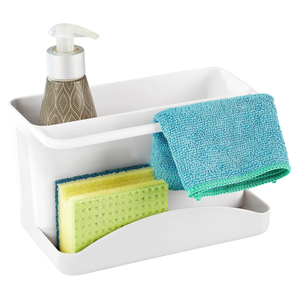 In dieser Spülutensilien-Organizer findet wirklich alles seinen Platz: Ob Spülmittel, Schwamm, Spültuch und -bürste – alles kann trocknen und ist sofort griffbereit. Leicht zu reinigen, immer hygienisch.