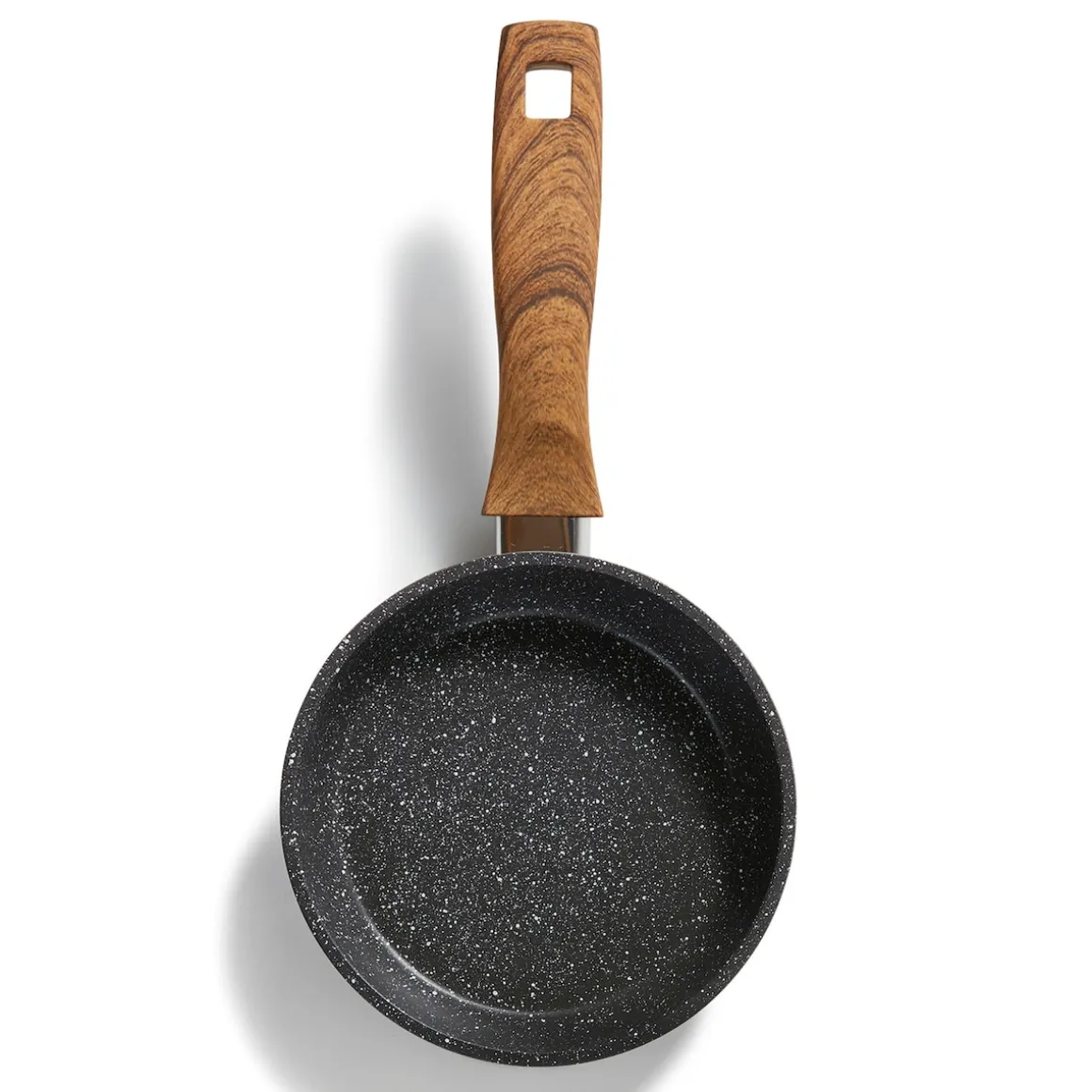 STONELINE – Das Original! Gesund fettfrei kochen und braten! Holz ist das angesagte Style-Element, um jedem Küchen-Ambiente einen warmen Akzent zu verleihen und eine beruhigende, ausgeglichene Atmosphäre zu schaffen. Die Back to Nature-Linie von STONELINE vereint diese Eigenschaften. Die Pfannen mit Griff in stilvoller Holzoptik werden selbst auf der gedeckten Tafel zu einem stimmigen Blickfang. Diese 14 cm Pfanne ist ein Muss in jeder Küche. Sie ist für sehr kleine Mengen optimal geeignet. Dank der speziellen STONELINE-Antihaftbeschichtung lassen sich Ihre Speisen – je nach Wunsch – mit oder ohne Bratfett und Ol zubereiten und ganz ohne Ankleben aus dem Kochgeschirr lösen. Hierbei spielt es keine Rolle, ob Sie auf Glaskeramik, Induktion, Elektro oder Gas kochen. In Pfannen mit der original STONELINE-Beschichtung bleiben keine hartnäckigen Reste haften und die einfache Handwäsche spart Ihnen Zeit und Mühe. 1 Bratpfanne Induktion, ø ca. 16 cm, Höhe: ca. 3,5 cm, ca. 0,5 l; Induktionsboden: ø ca. 13,5 cm Die wichtigsten Vorteile des STONELINE Kochgeschirrs auf einen Blick: Weltweit einzige Antihaftbeschichtung mit echten Steinpartikeln Kratzfeste STONELINE-Antihaftbeschichtung Vitaminschonend kochen und braten ohne Fett und Ol Optimales Bratergebnis und kross gebratenes Fleisch Auch für Vegetarier geeignet: Gemüse bleibt knackig und saftig Kein Anbrennen und kein Ankleben Super leicht zu reinigen Extra starker, verzugsfreier Boden Bodenstärke: ca. 4,7 mm Für alle Herdarten geeignet, auch Induktion Backofengeeignet bis 180 °C Material: Aluminiumguss Reinigungs- und Pflegetipps: Vor dem ersten Gebrauch empfehlen wir, Ihr Koch- oder Backgeschirr mit etwas Wasser und einem milden Spülmittel gründlich auszuwaschen. Verteilen Sie anschließend mit einem Papierküchentuch einige Tropfen Speiseöl auf der Beschichtung. Bei der weiteren Nutzung können Sie auf den Einsatz von Fett oder Ol verzichten! Dank dem Easy-Clean-Effekt wird die Reinigung per Hand empfohlen. Einfach mit heißem Wasser, Handspülmittel und einem weichen Schwamm auswischen.
